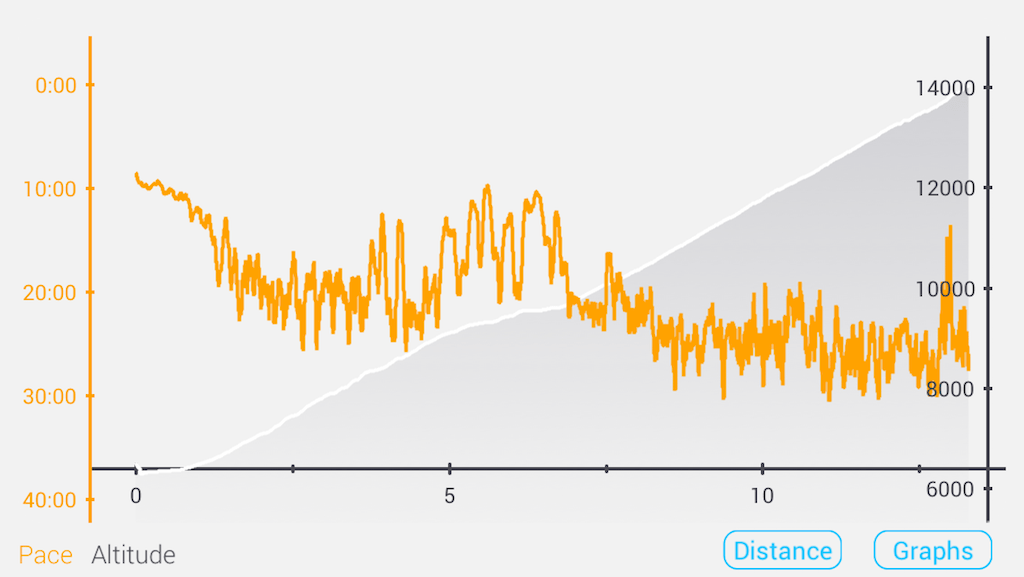My line for the race: 4:34:31 was my time. 766th out of 1697 finishers. 69th out of 147 in my age group finishers. I could call it the slowest half-marathon I’ve ever run…or the fastest I’ve ever run up a 14-er. My elevation and pace chart is included below for your viewing pleasure.