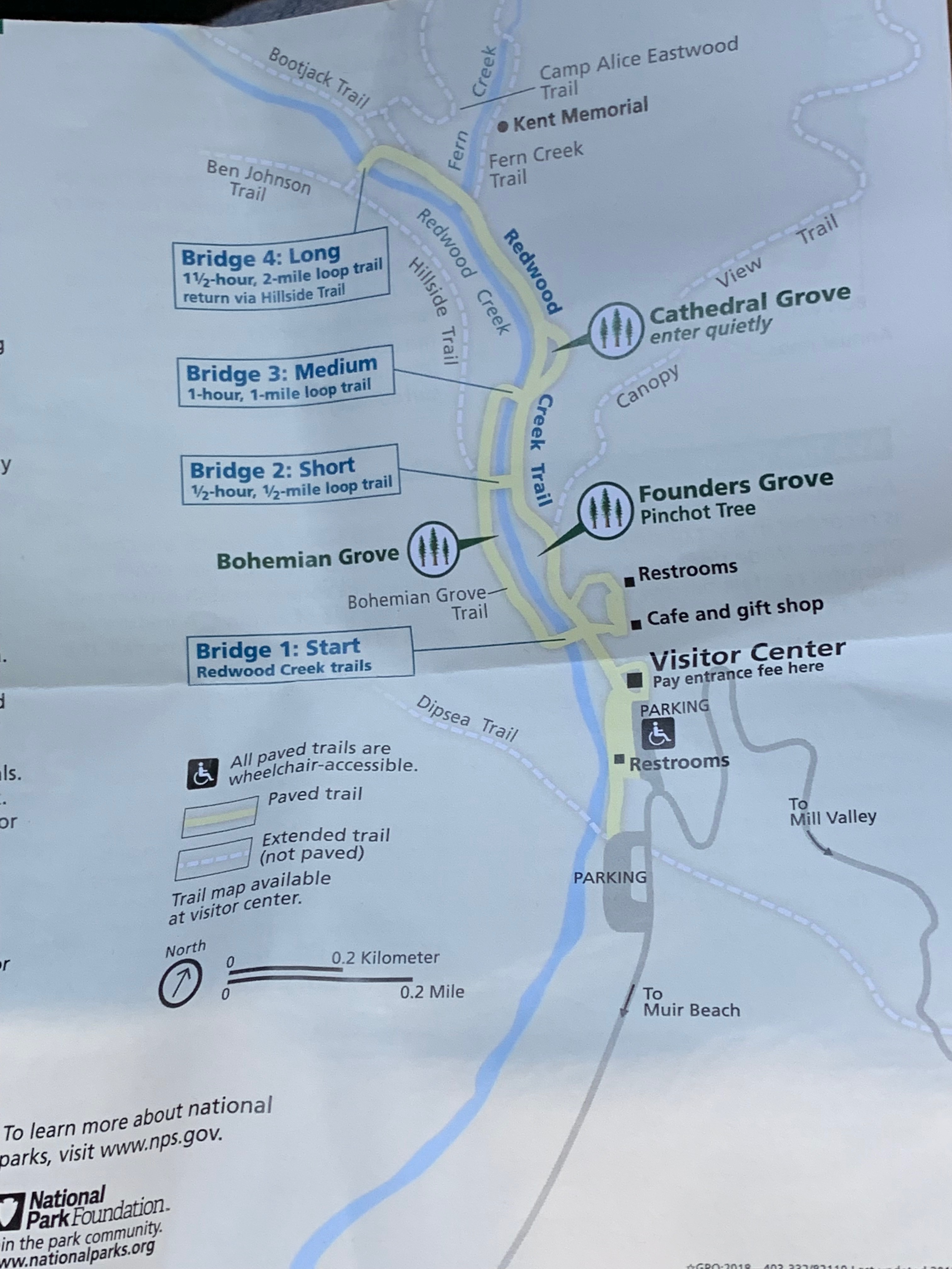 The park (formally termed Muir Woods National Monument) consists of two main trails and several branch trails. The two main trails are connected by four bridges (see the scanned park trail map below). On our visit in October, 2018, we parked at the parking lot through which the Dipsea Trail runs through. This trail is the namesake to the Dipsea Race, a 7.4 mile seeded race from Mill Valley to Stinson Beach. We did not hike this trail today but the race is definitely on the bucket list.