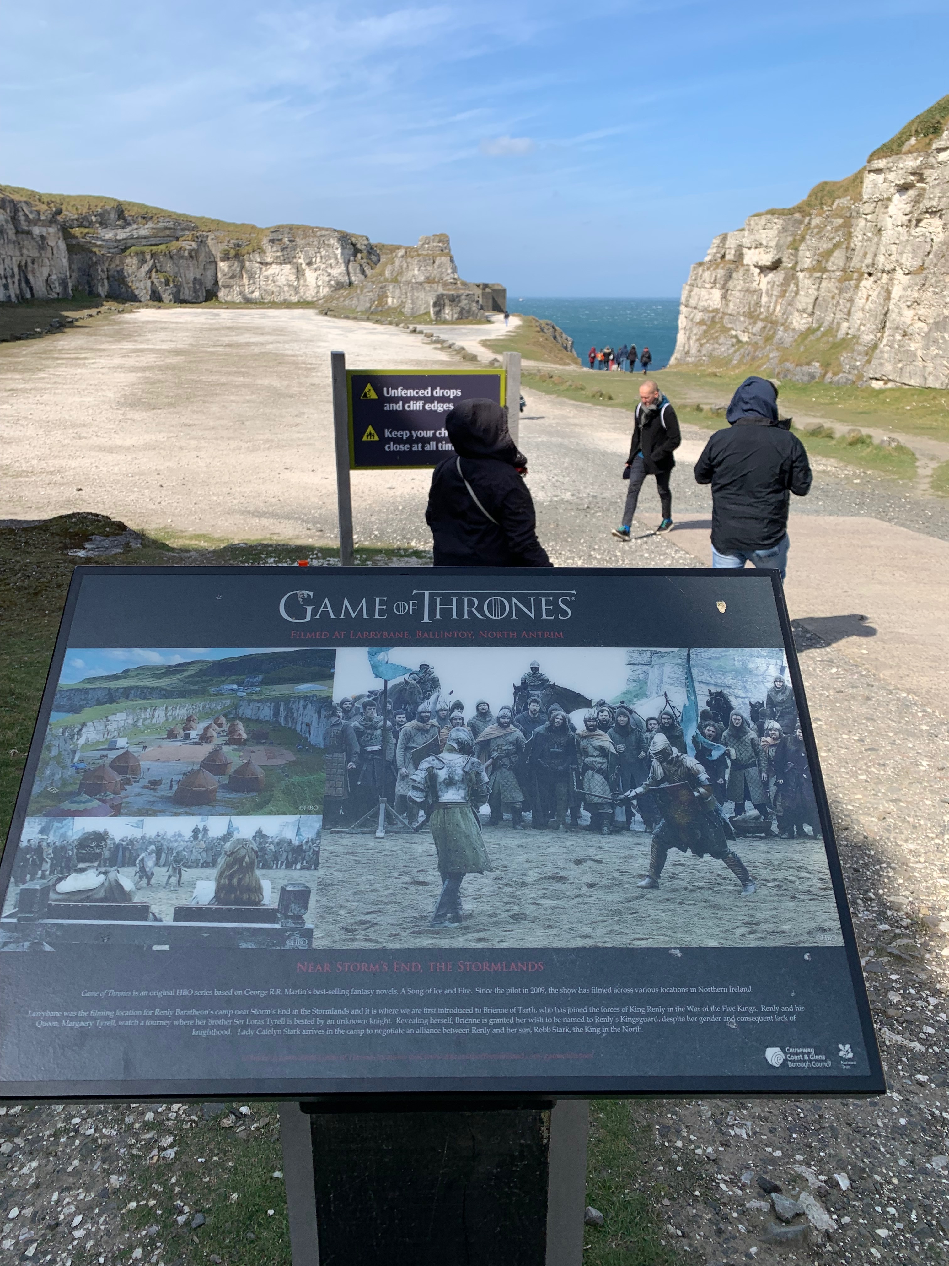 When you enter the car park, the path to the rope bridge is to the right. If you go left, the path takes you to Larrybane, the site of King Renly’s camp where Briene fought Ser Loras and won. She was then granted her request to join Renly’s Kingsguard.