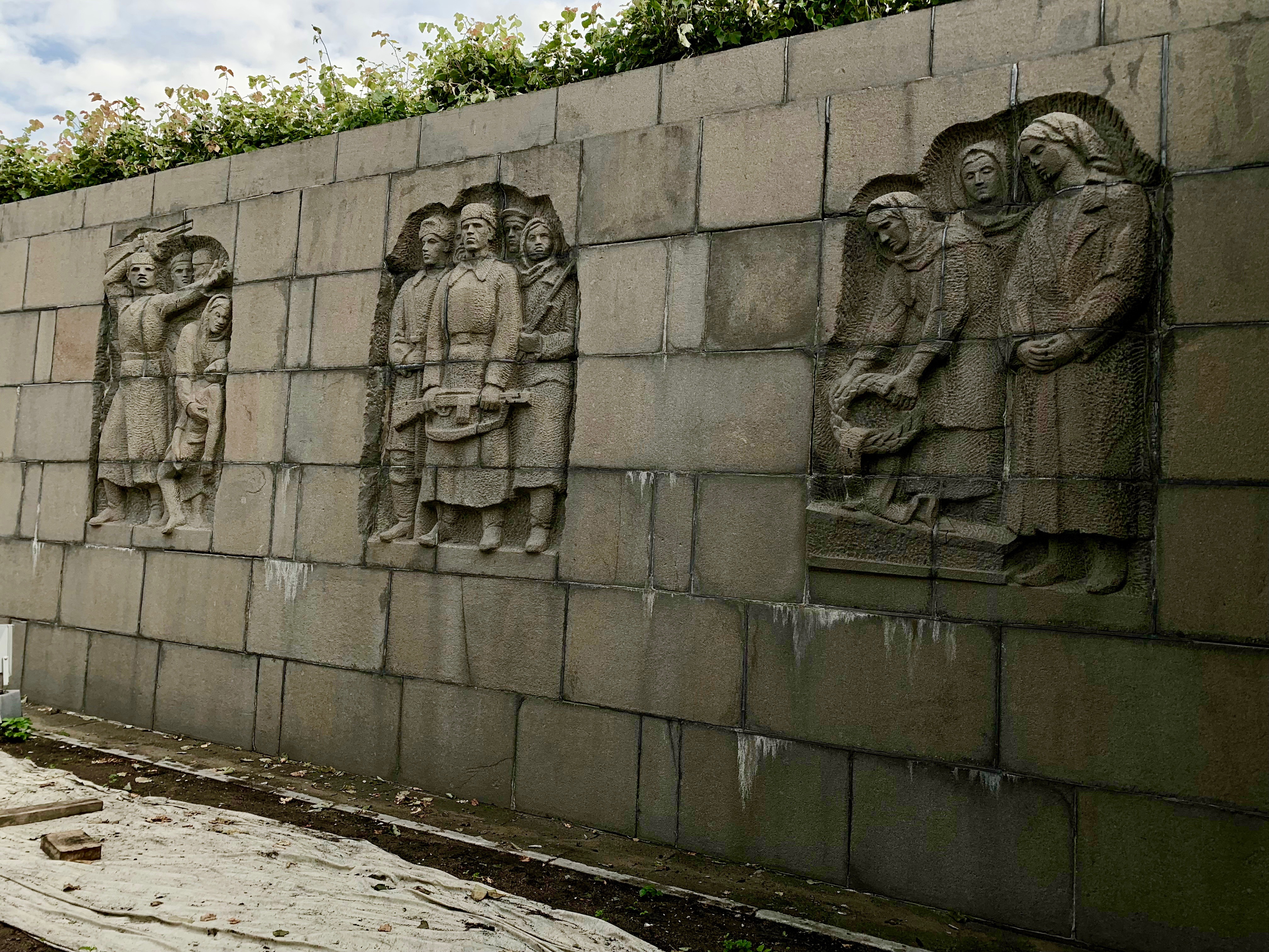 The wall behind the statue was covered up for cleaning, but features some bas-relief sculptures featuring the citizens of Leningrad.