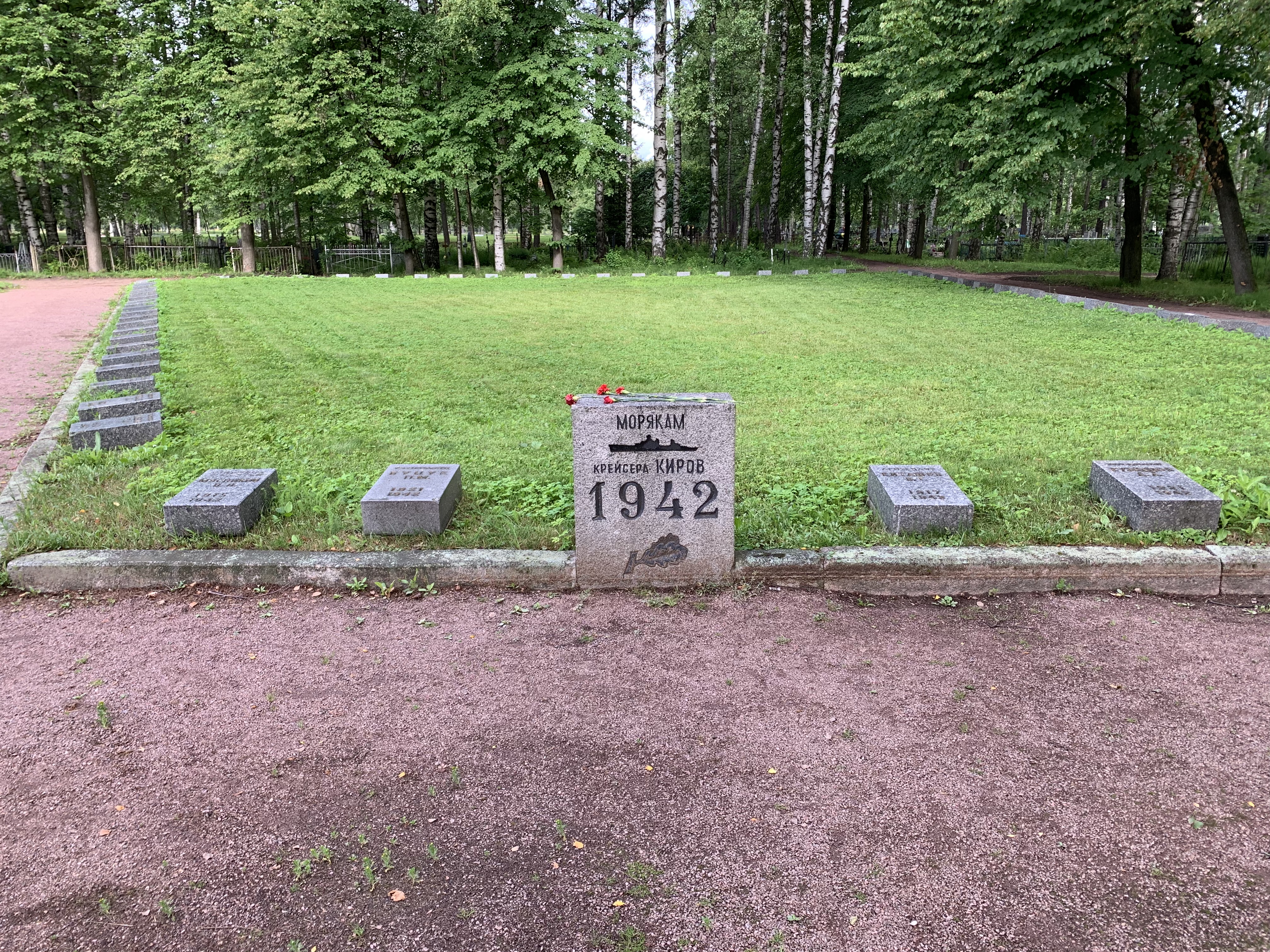 Seamen from the cruiser Kirov are buried (with individual plaques) in graves with tombstones marked with a ship. These men were killed during a battle in April 1942.