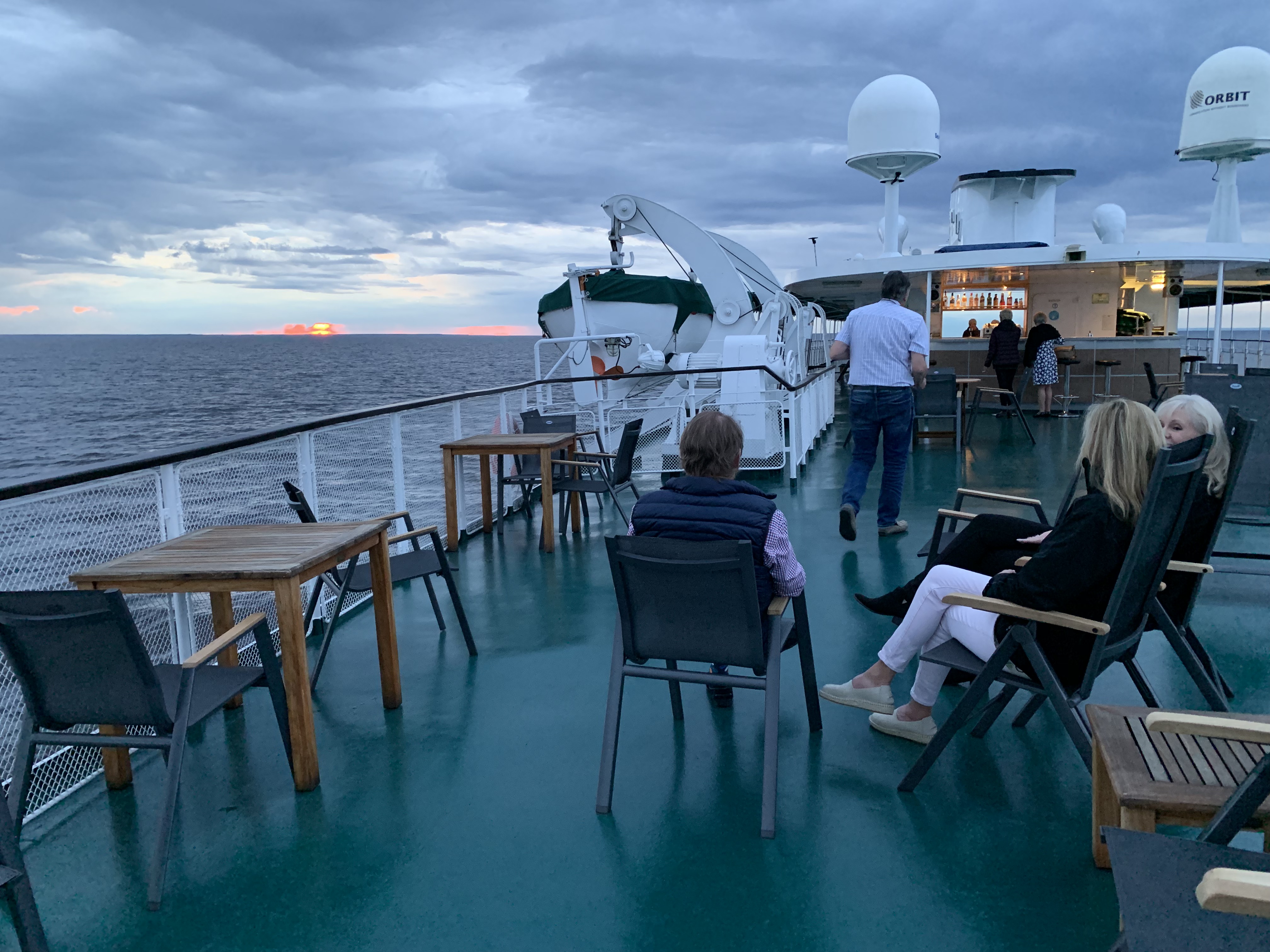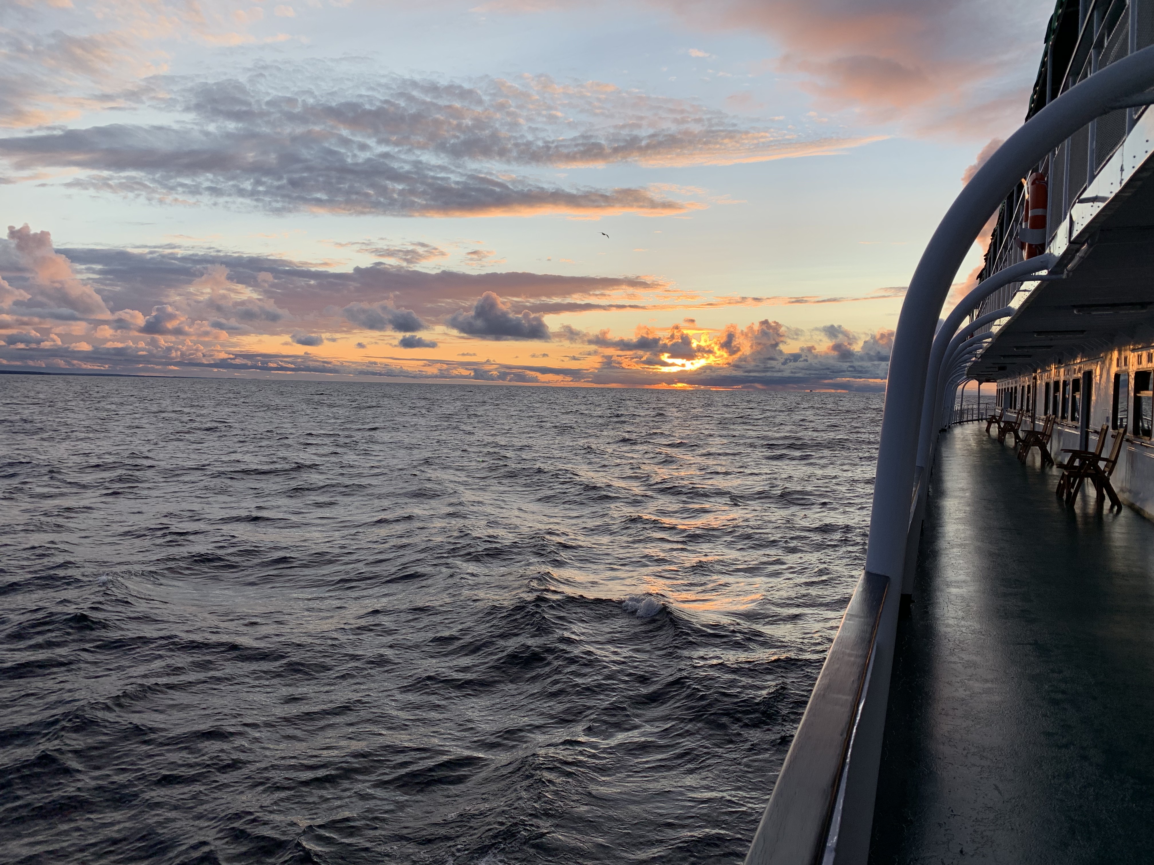 The ship had a restaurant, a lounge on the top deck, a very small exercise room in the middle of the bottom deck (and by small I mean a rowing machine, a treadmill and a bike, all in a row!), a couple of bars and a library area. The rooms had no balconies, but there were ample sitting areas along the sides and in the back of the boat. We watch several nice sunsets off the back of the ship.