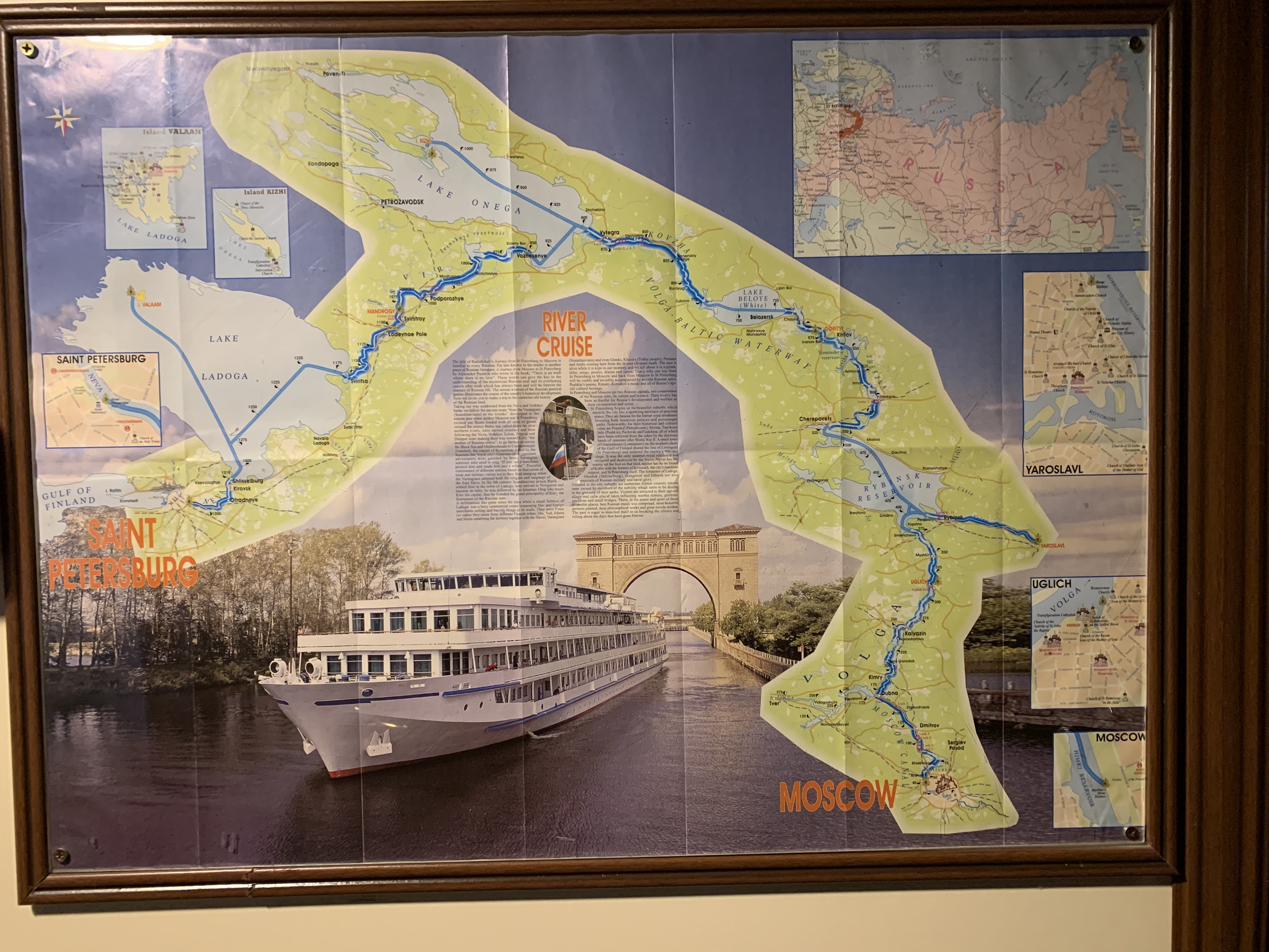 This map depicting our Volga River Cruise route was posted in the hallway leading to the dining room onboard. Except for the one stop depicted in the north of Lake Lagoda, it shows the route our cruise took. The cruise went Moscow – Uglich – Yaroslavl – Goritsy – Kizhi Island – Svirstroy – St. Petersburg, departing Moscow on the evening of July 7 and arriving St. Petersburg the morning of July 13.