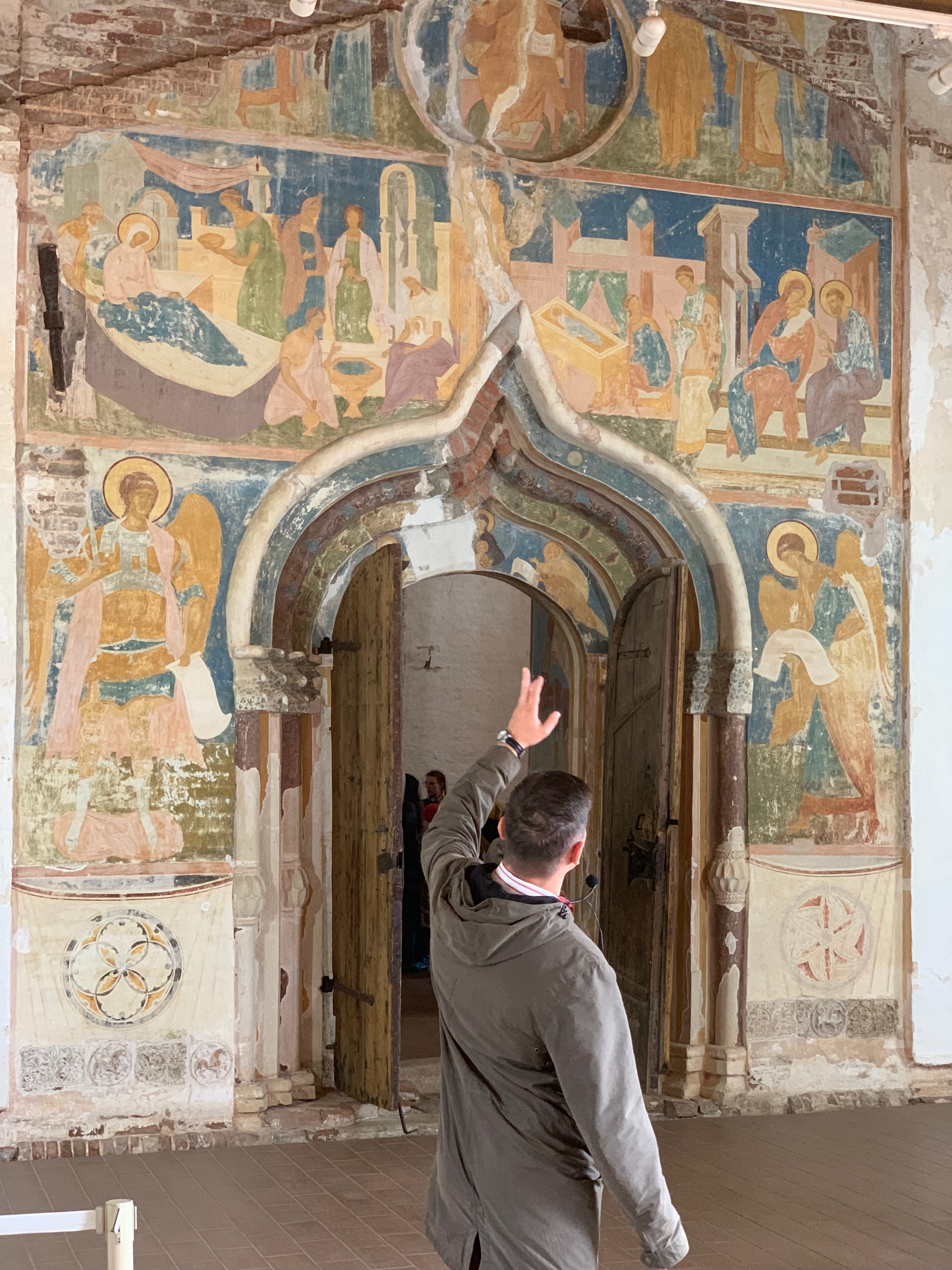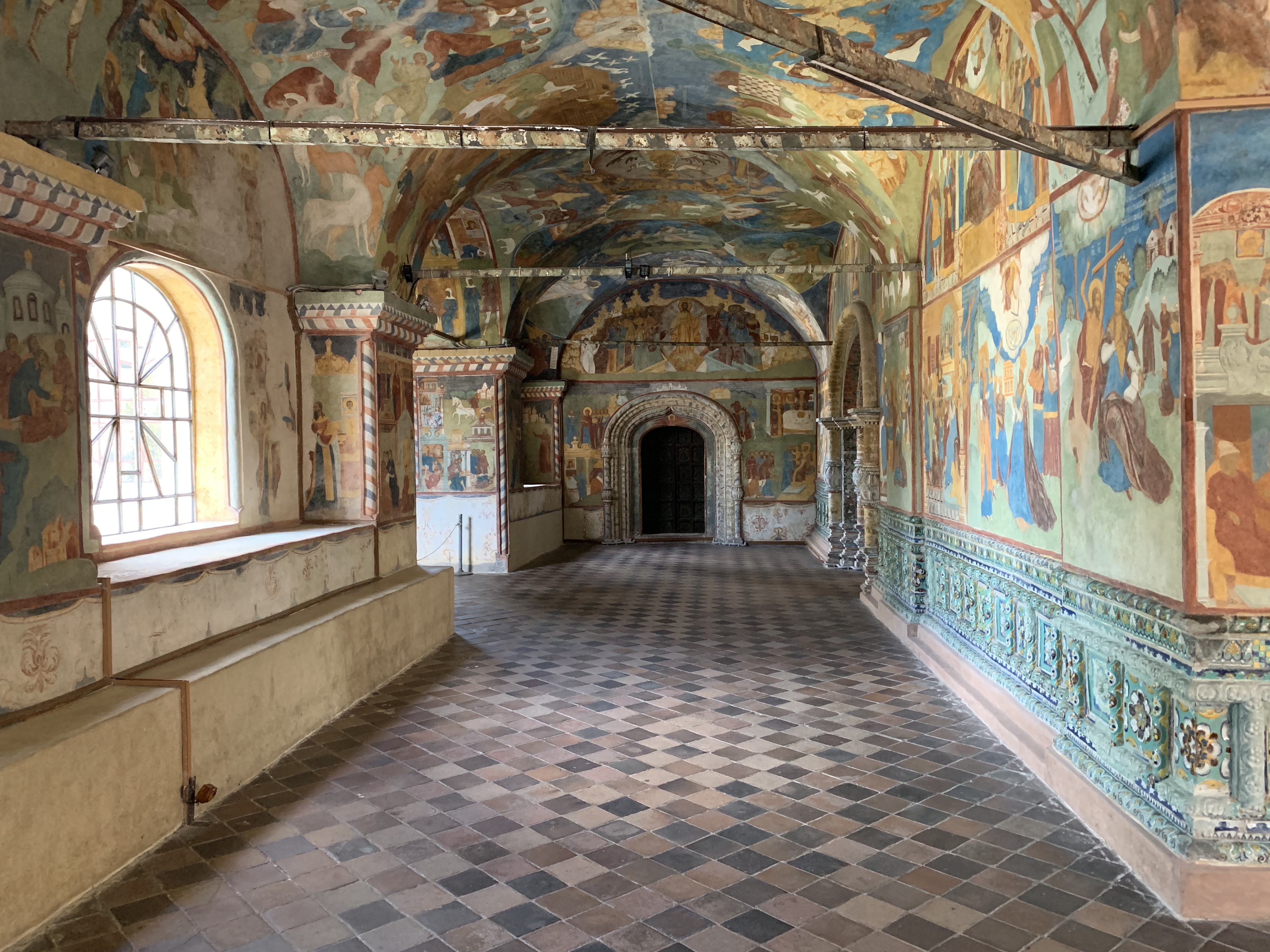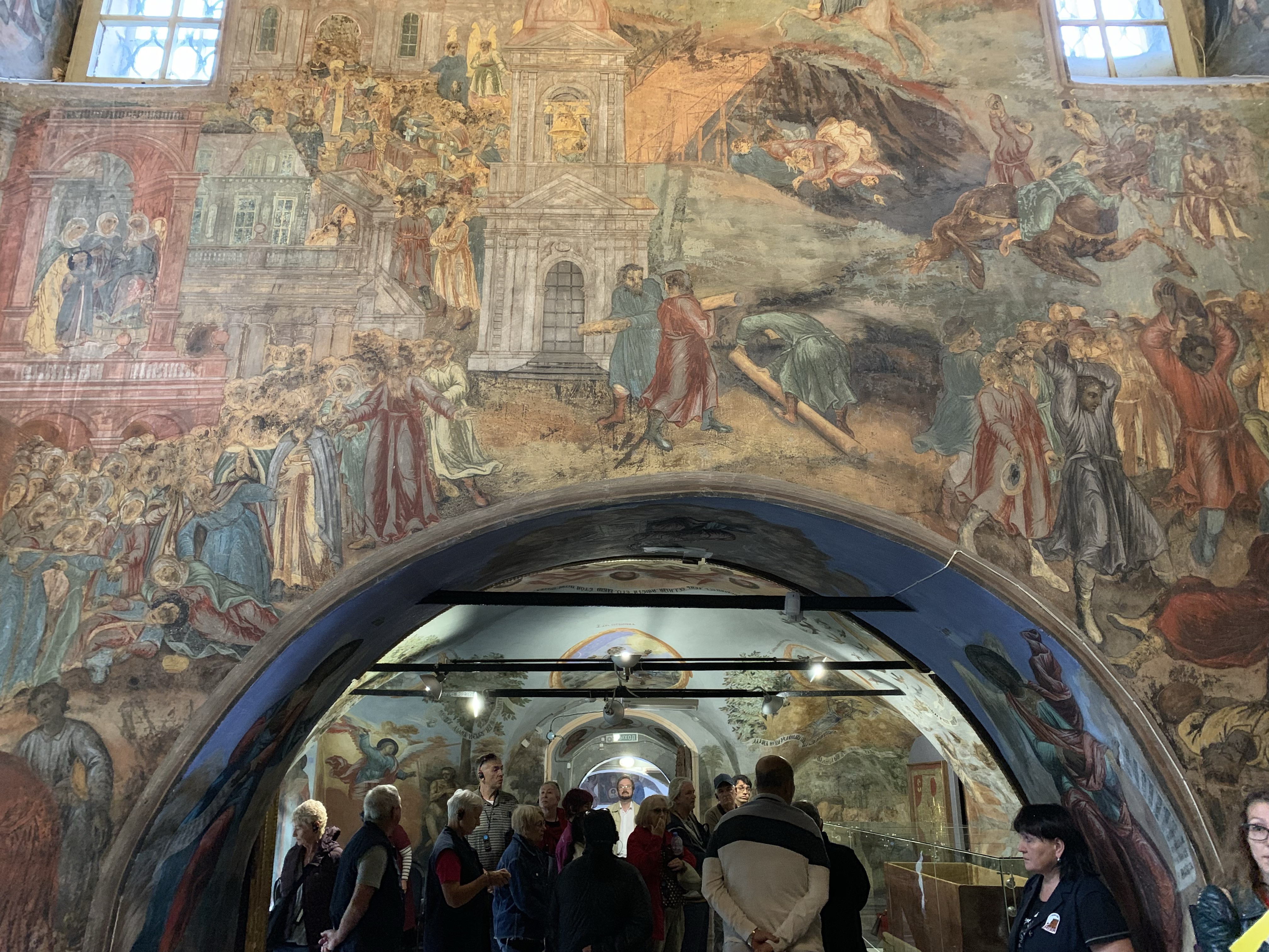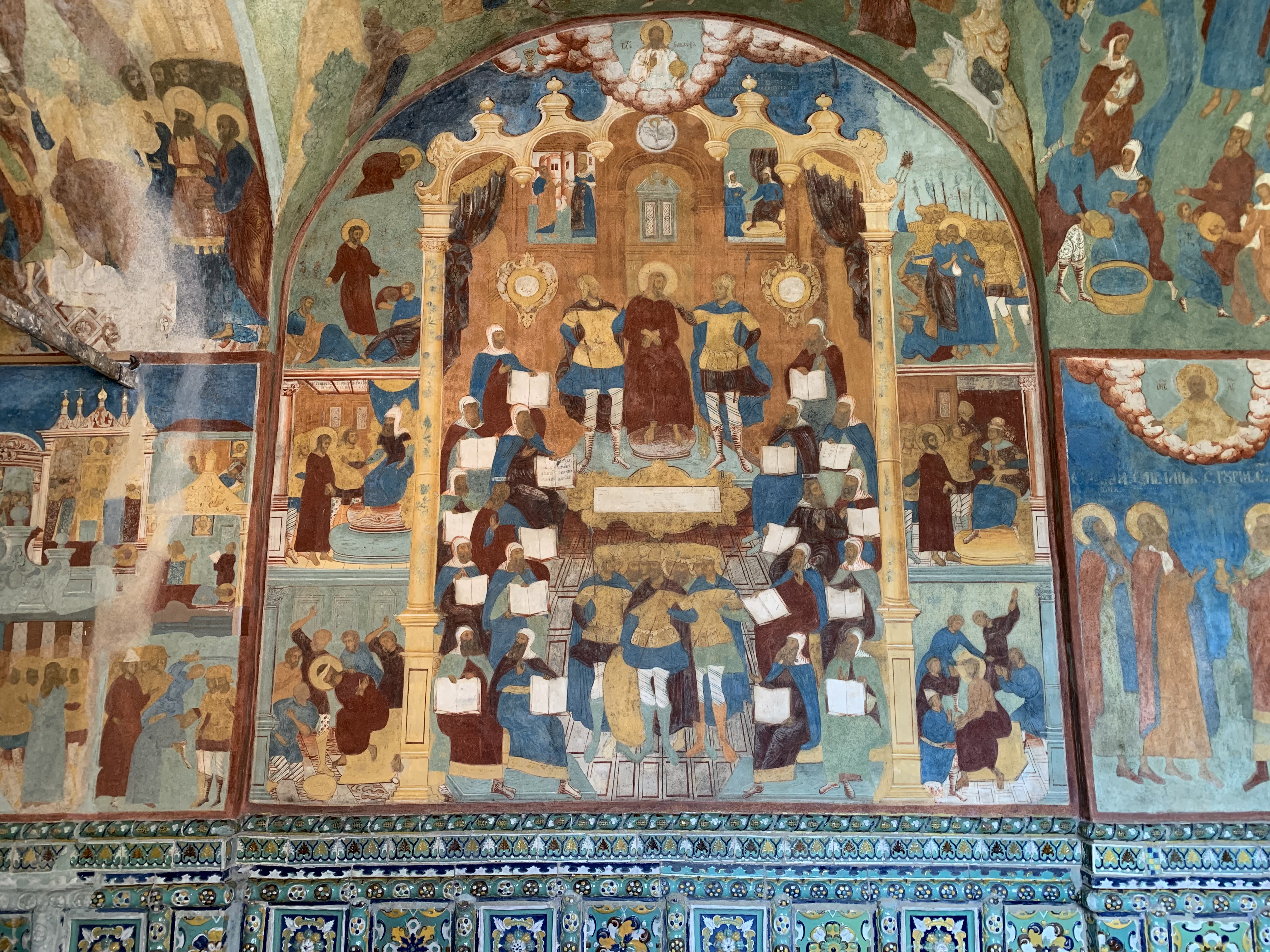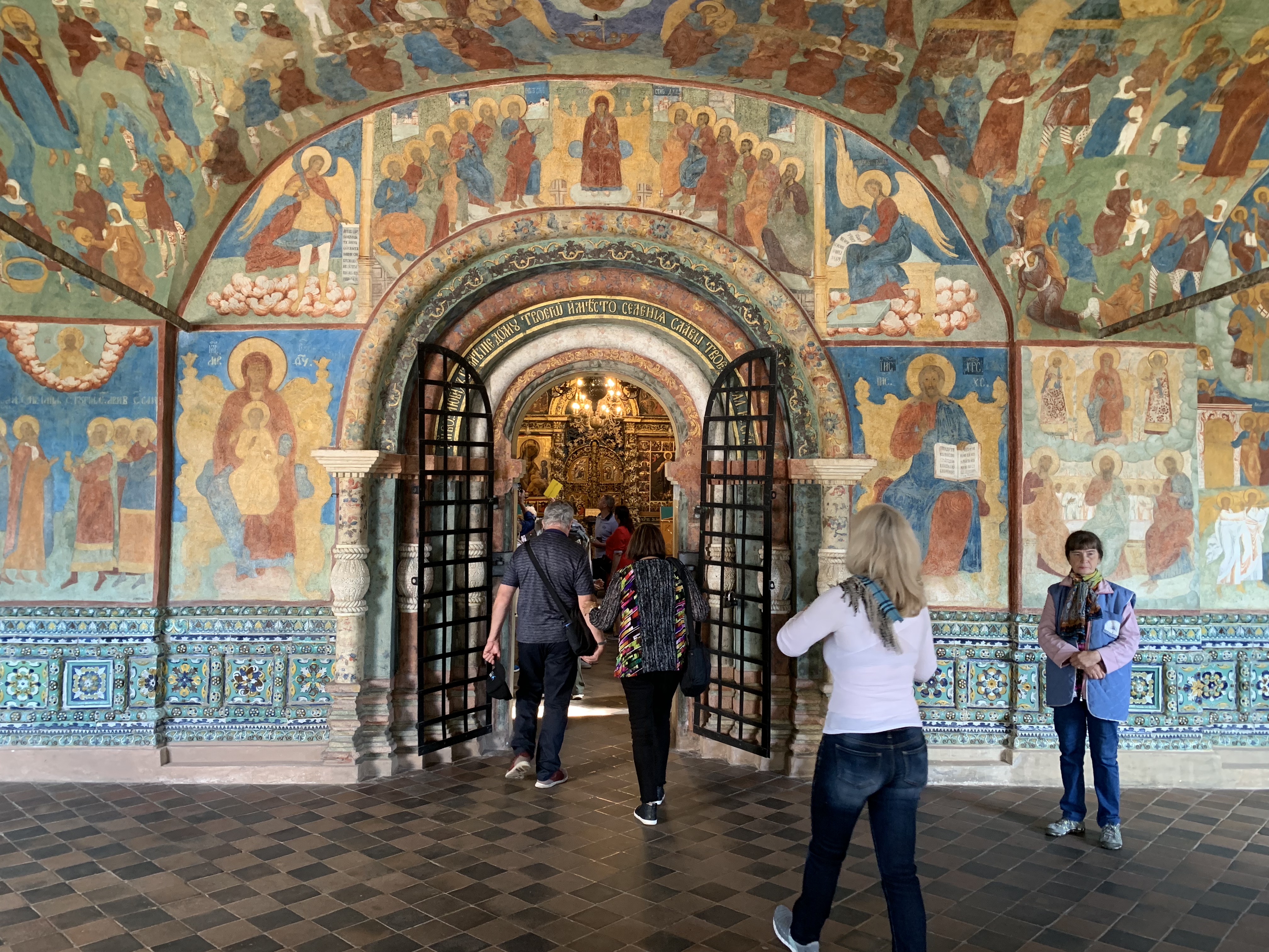 The frescoes in the Cathedral of the Nativity of the Virgin were done by the painter Dionisy in the 1490s. Dionisy also painted icons in the Cathedral of the Dormition that we saw at the Kremlin in Moscow. This cathedral is the last surviving medieval Russian church with fully painted walls. For that and other obvious reasons the caretakers at the Monastery were very careful with how many people were let into the Cathedral. We were initially going in, but held up because the temperature and humidity sensors in the Cathedral had risen above their safety levels with the number of people inside.