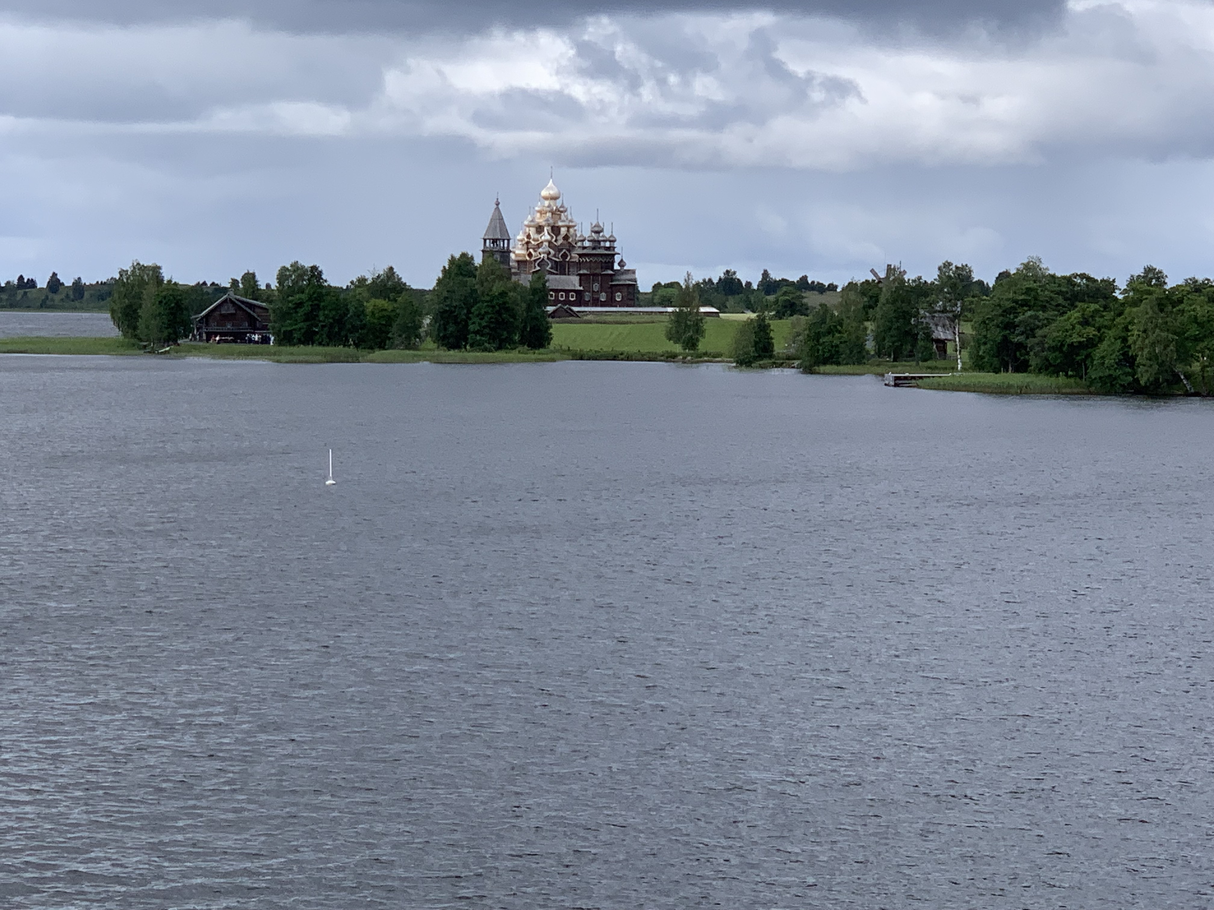 The ship departed around 2pm, headed for Kizhi Island which was almost 200 miles away. The path would be up the Sheksna River. We’d cross Lake Beloye (Бе́лое о́зеро), also known as the White Lake, then the Kovzha River to cross to Lake Onega. As the ship got to the White Lake, we passed what remains of the Nativity Church in Krokhino. Several of the towns had been in the “inundation zone” when the Volga-Baltic Waterway was deepened in the 1960s. Being in the “inundation zone” meant that everything went underwater. Entire villages were moved…except for churches that could not be.