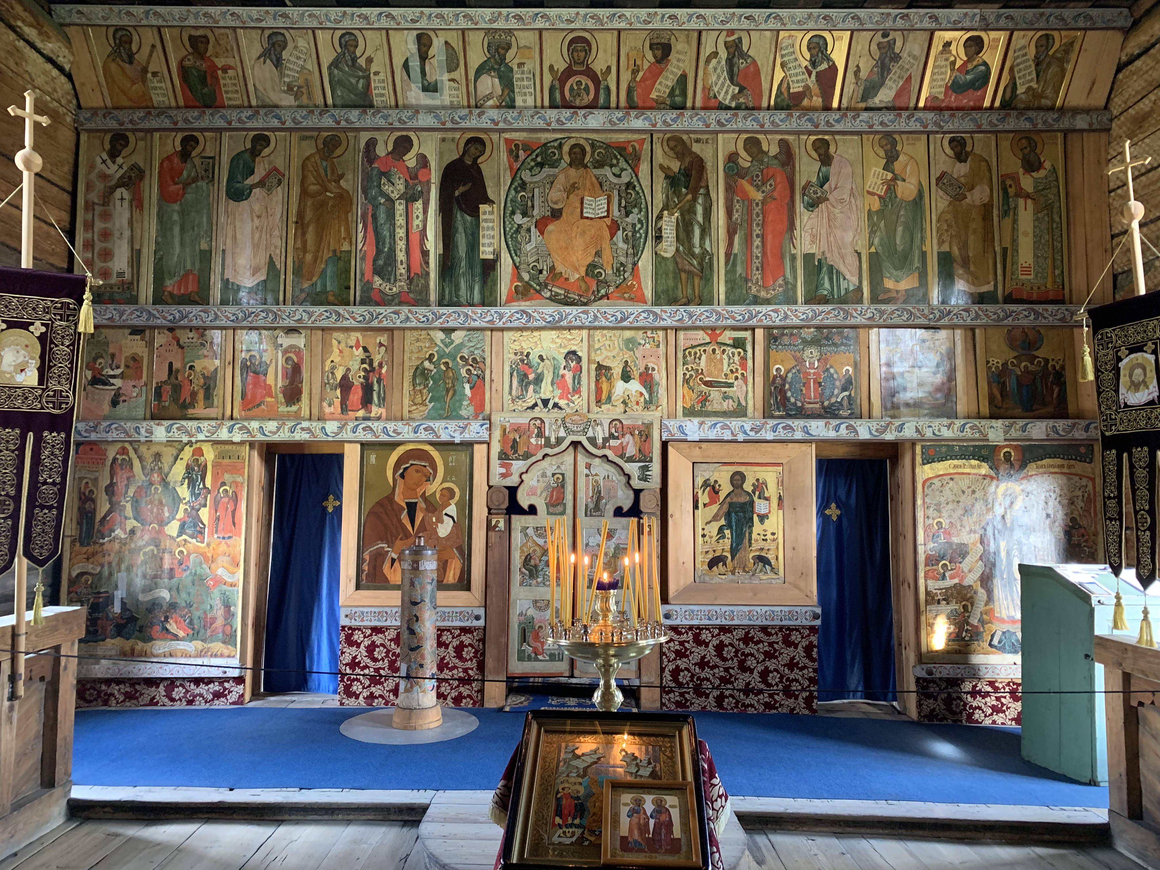 The Church of the Intercession (церковь Покрова Богородицы, also called Saint Virgin’s Protection Church) is next to the Transfiguration Church. It was rebuilt after a fire just before 1700, before the Transfiguration Church. It is the nine-domed structure to the right in the photo below. The cupolas of both churches are covered with aspen shingles that were carved by hand.