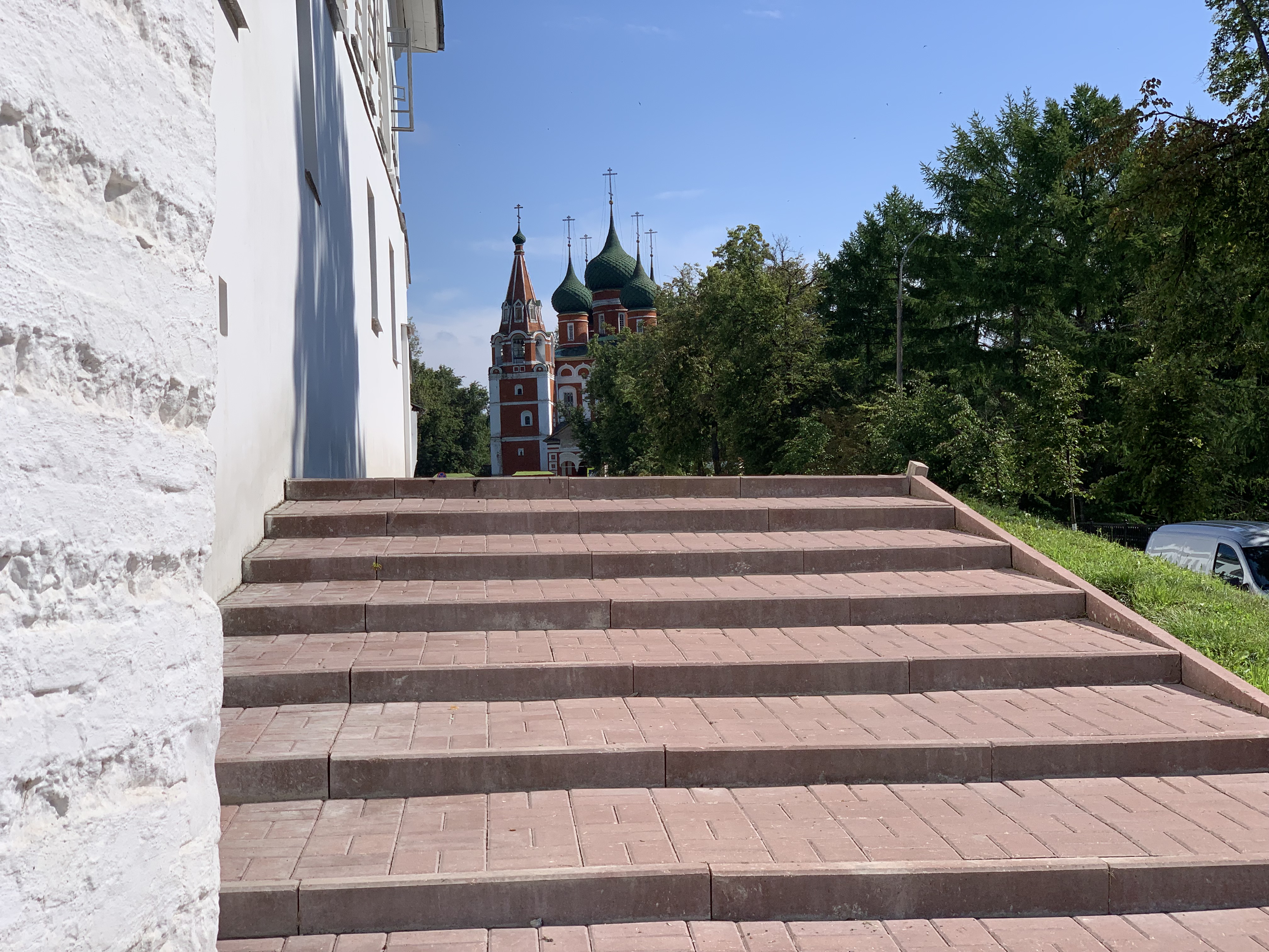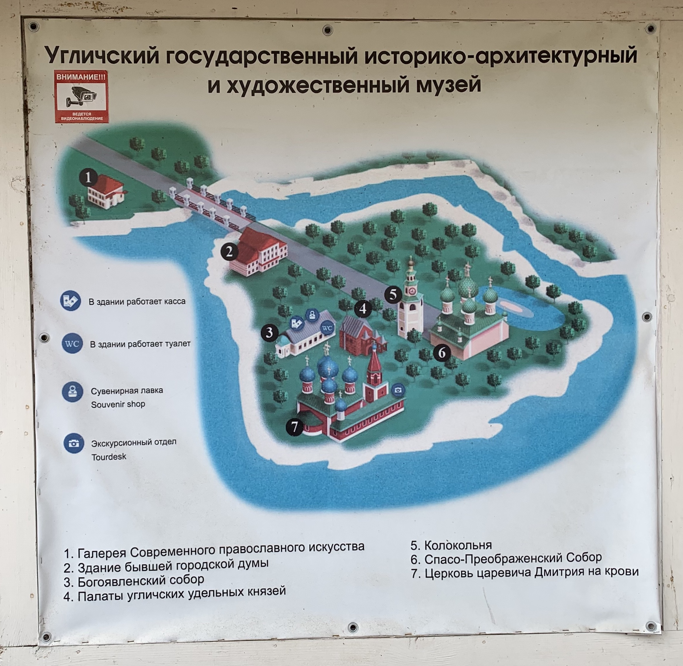 Below is a map of the small Kremlin area in Uglich. The Church of St. Dmitri on the Blood is depicted in its red and blue domed colors.