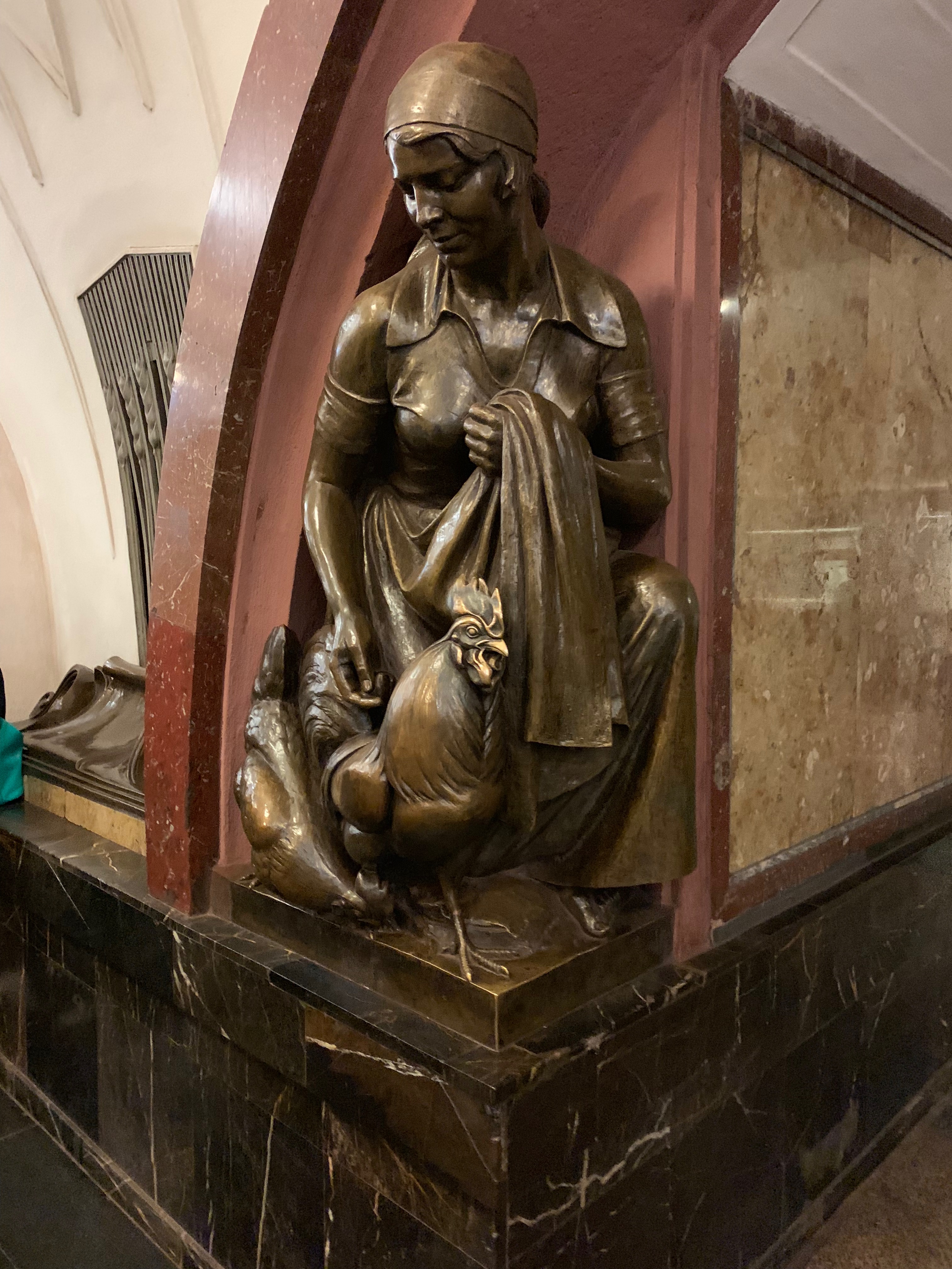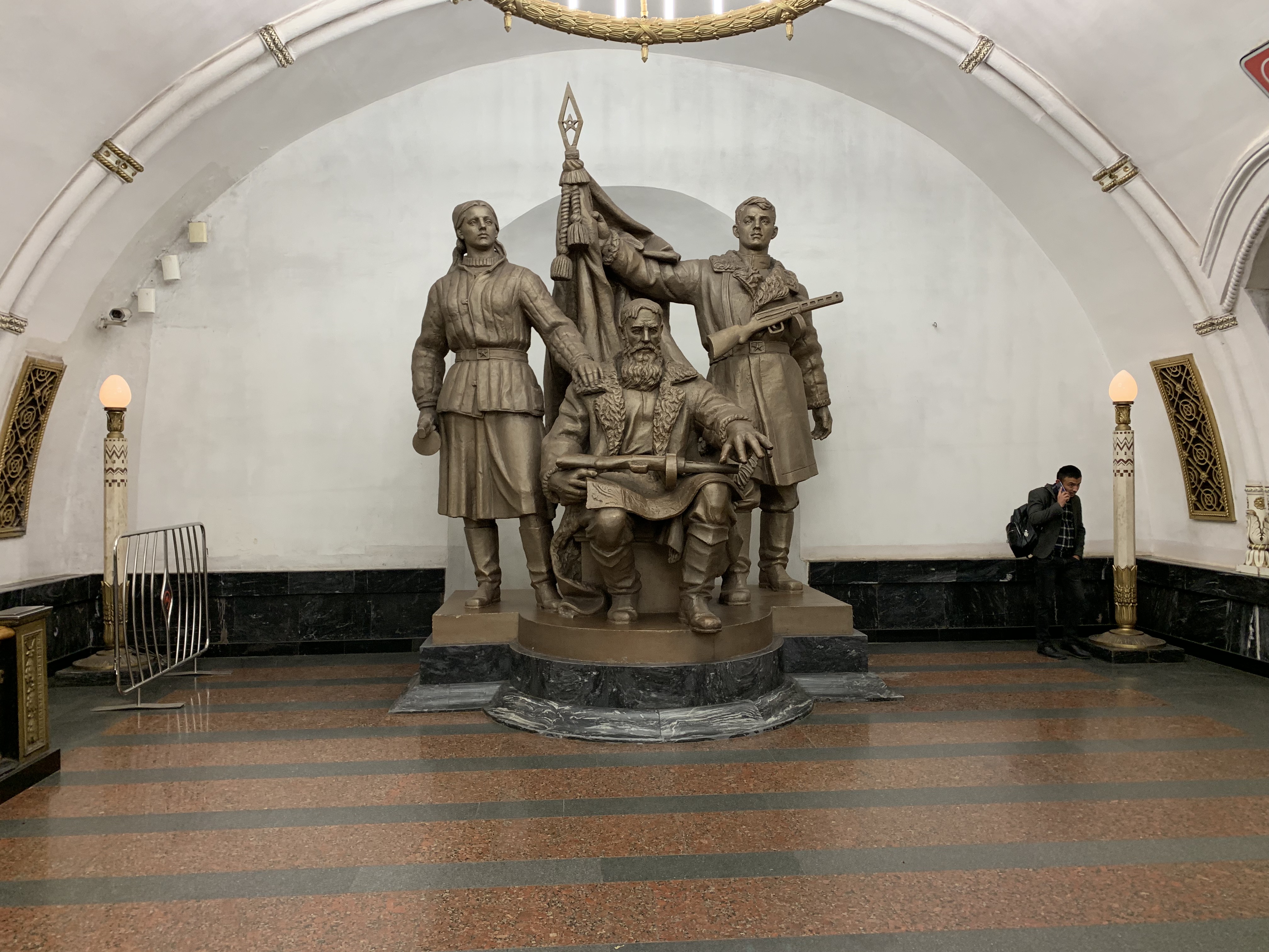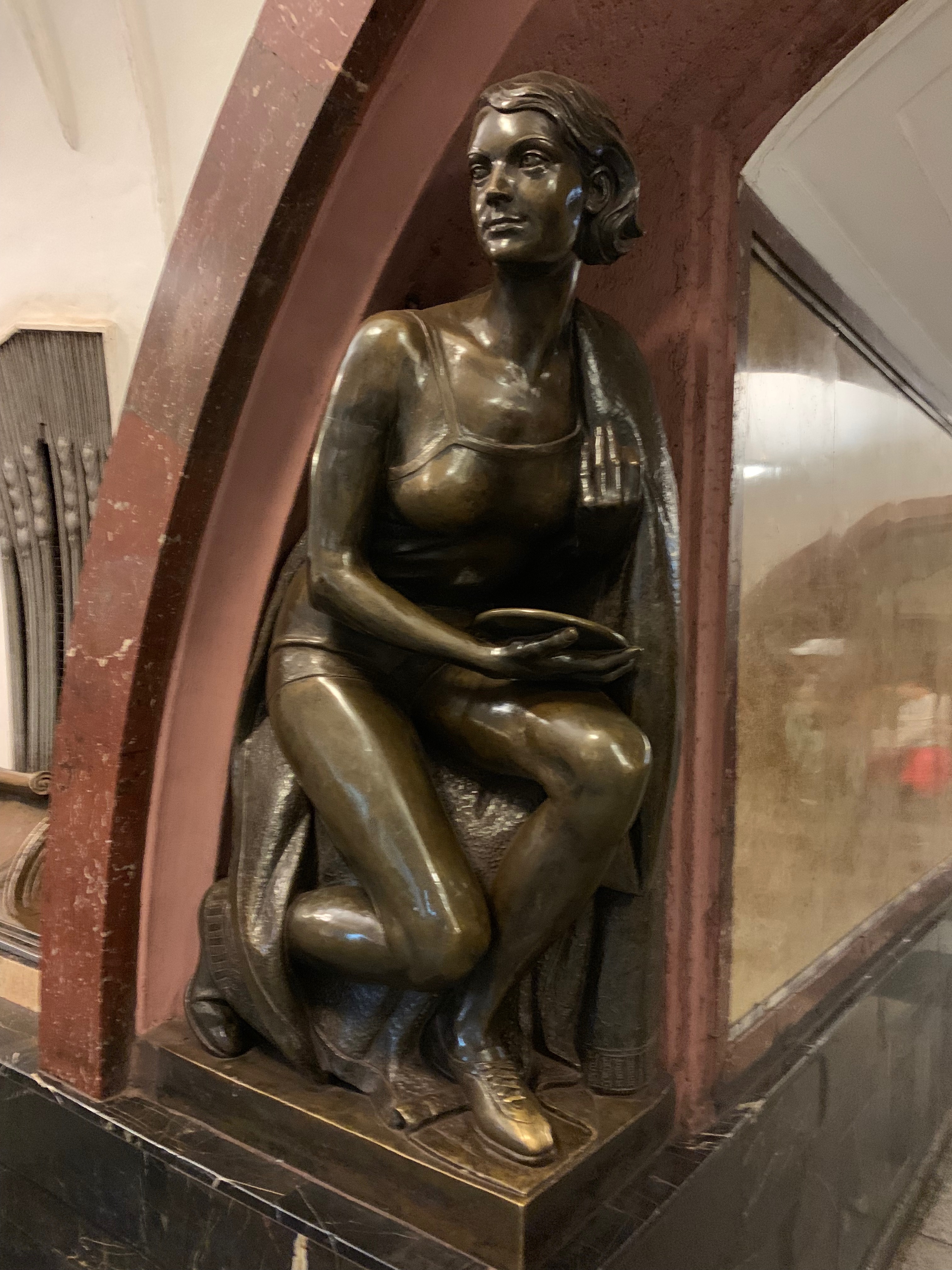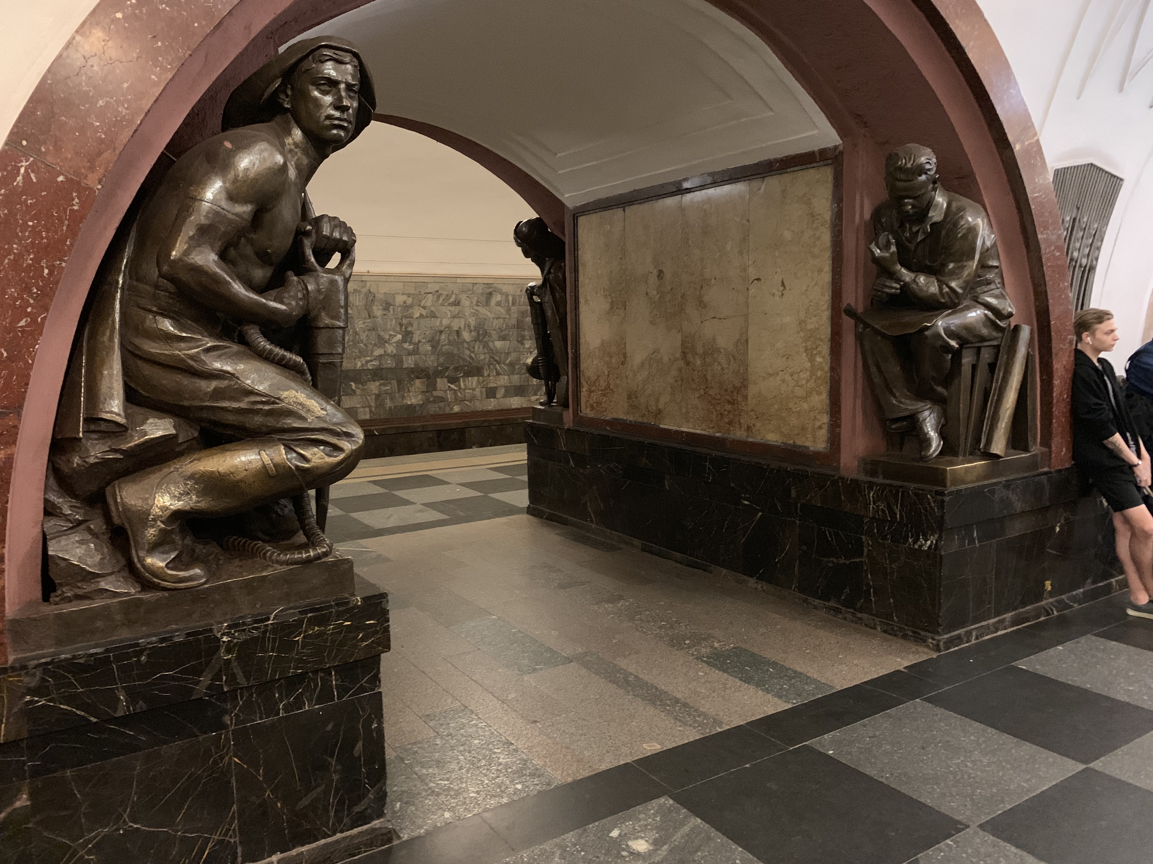 This station had 76 statues (a pair flanking each arch) of many different types of Soviet people. The sculptures are arranged in chronological order from October 1917 to December 1937. According to one article I read there are 20 different designs: 18 of them are repeated four times, and two are repeated twice.