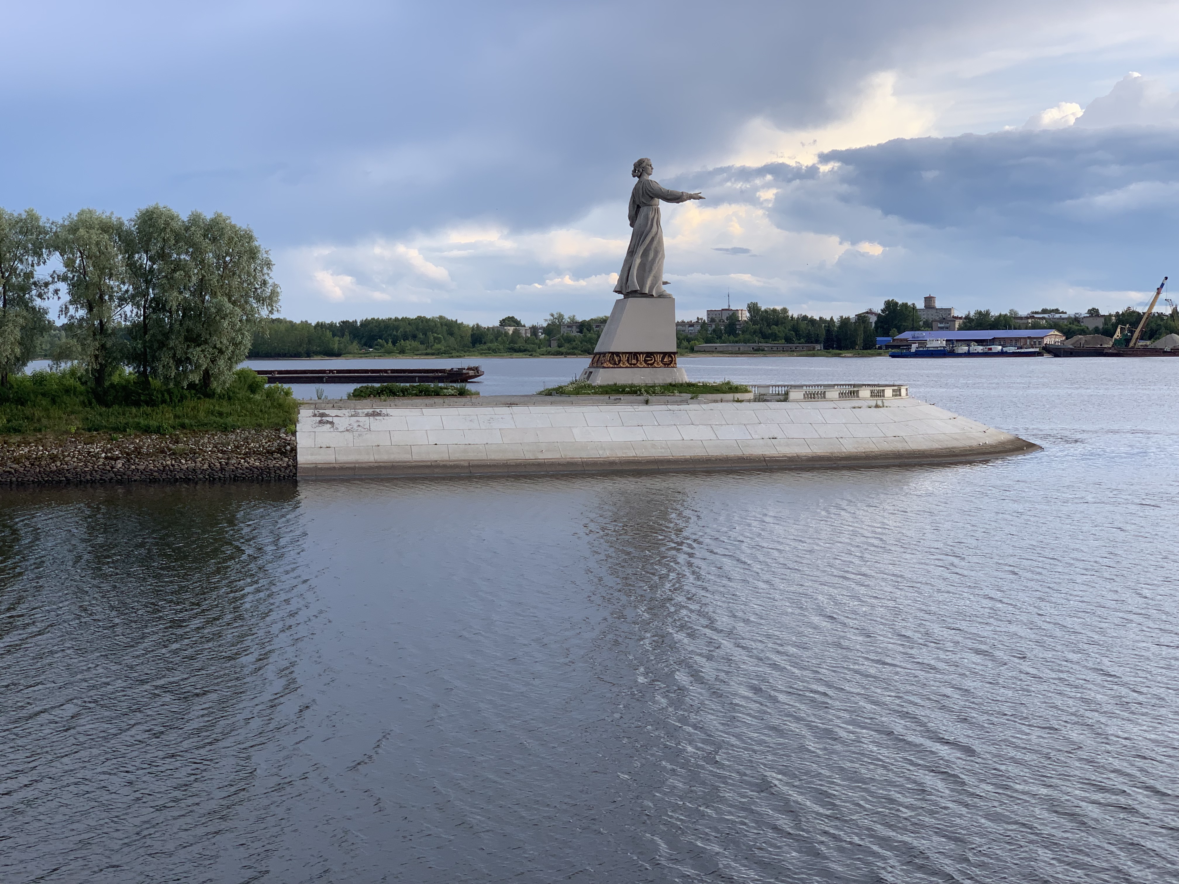 The path of our Volga River cruise back-tracked a bit, and then headed out into the Rybinsk Reservoir. Guarding the entrance is the statue of Mother Volga.