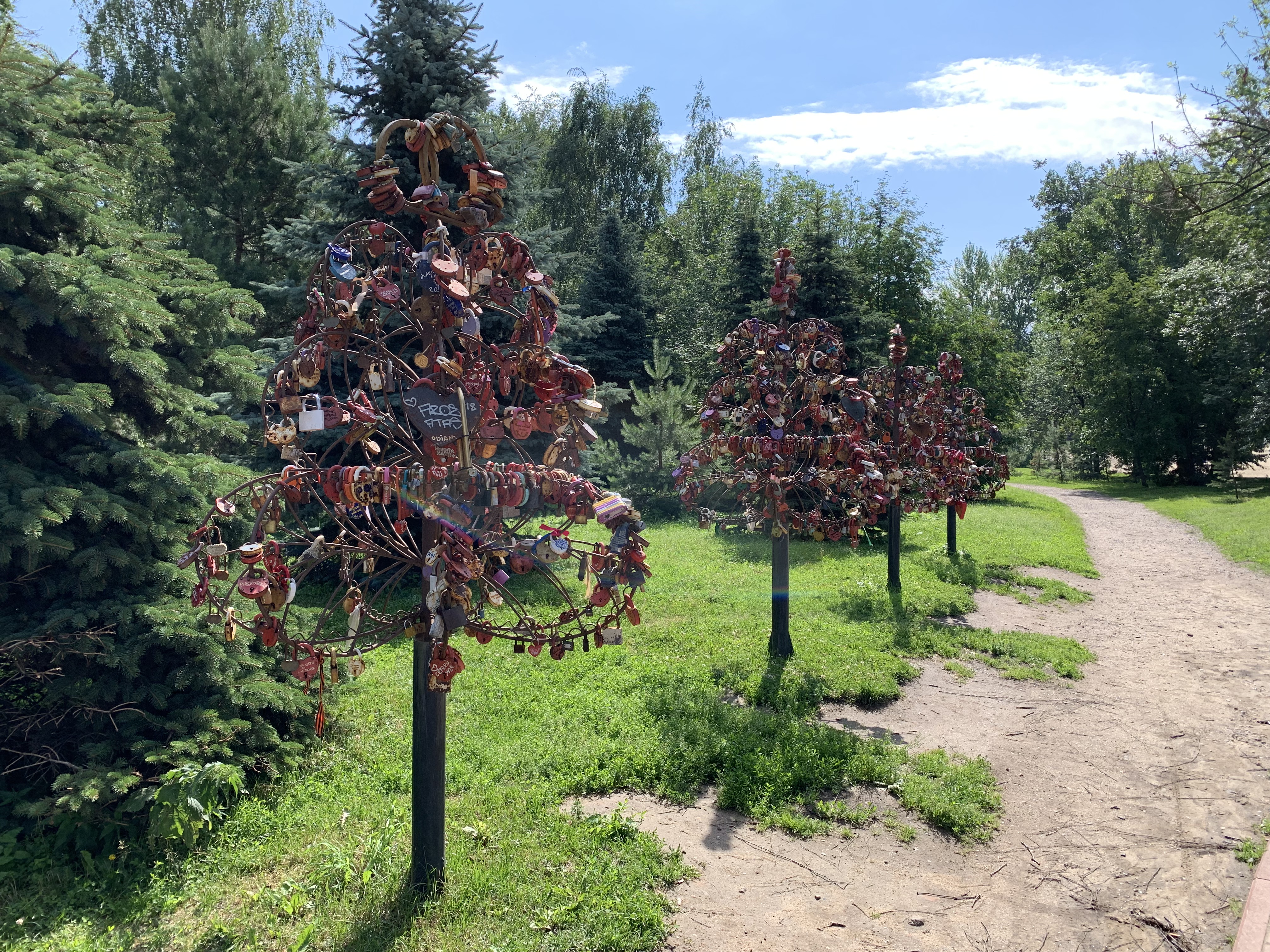 The park across from the entrance to the Monastery had a monument and trees with locks on them.