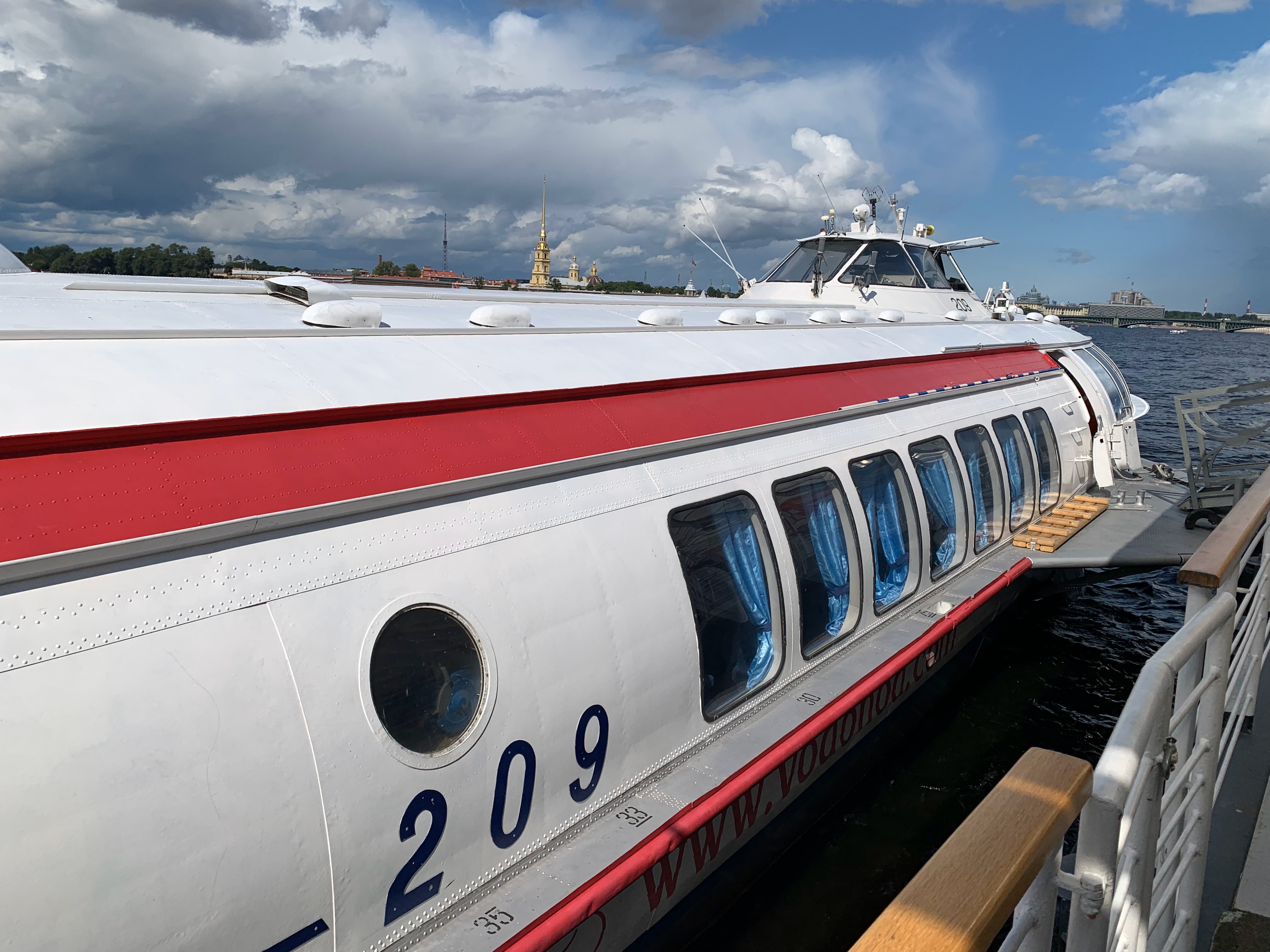 The Hydrofoil ride took between 30 and 45 minutes. The trip leaves from the docks along the Neva River and ends at the docks within sight of the major fountains known as the Grand Cascade.