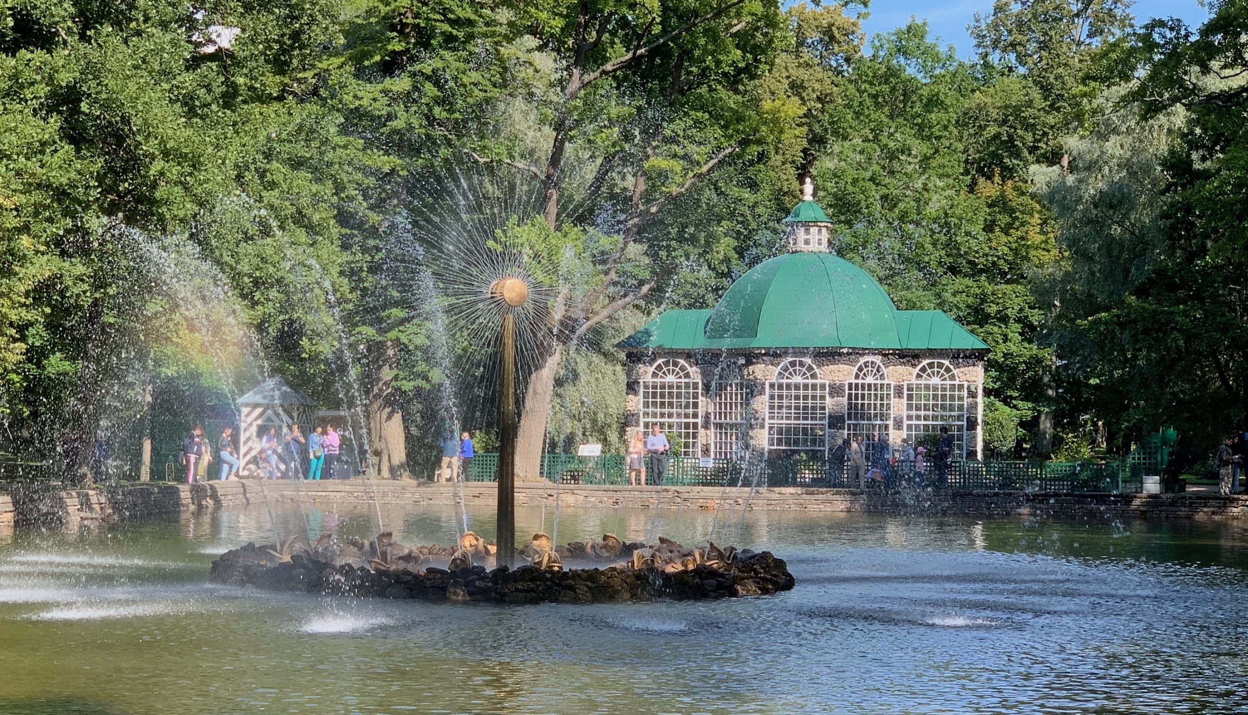 From the Monplaisir Palace we walked up the alley toward the hillside where Peterhof Palace stood. Along that alleyway is the Sun Fountain, and past the fountain is the Aviary.