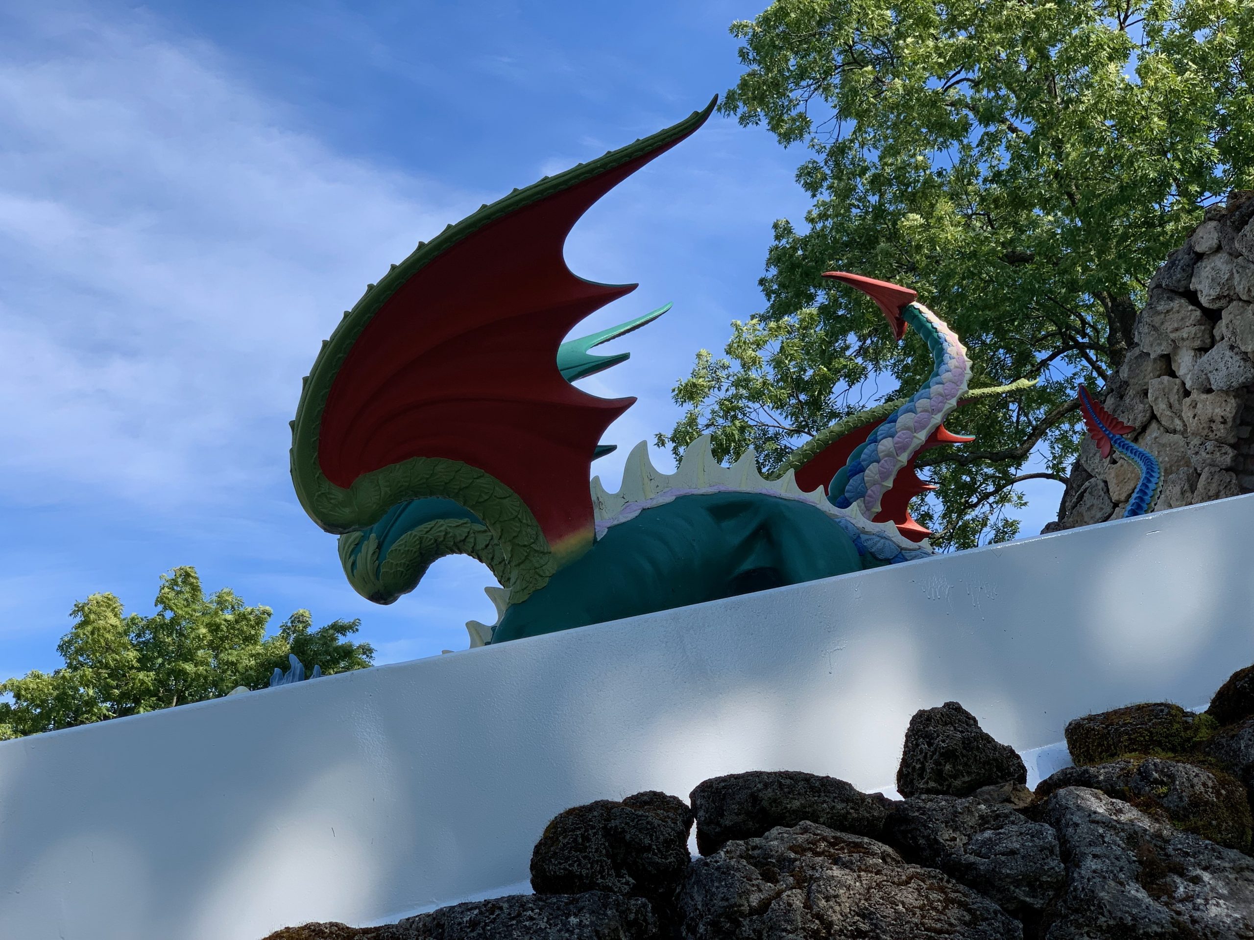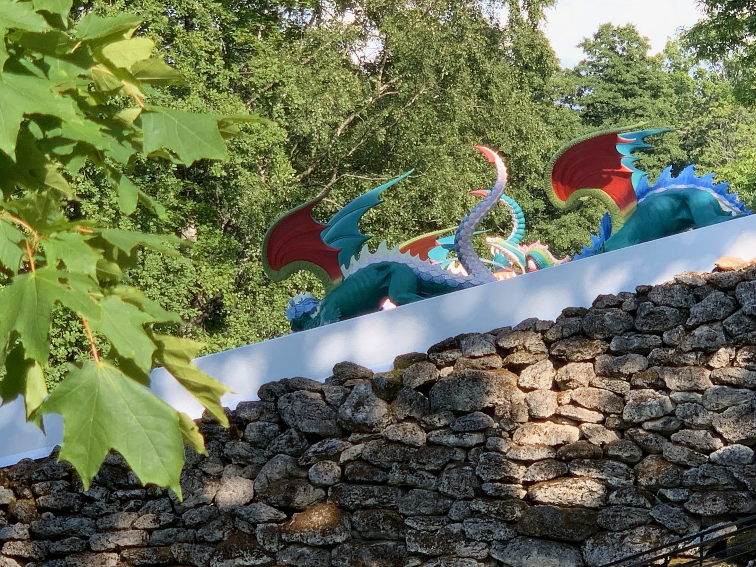 There is a rock wall lining the edge of the cascade, so after I climbed up the stairs I couldn’t get a photo of the entire dragon. But the amazing colors on their wings can be seen in the photo below.