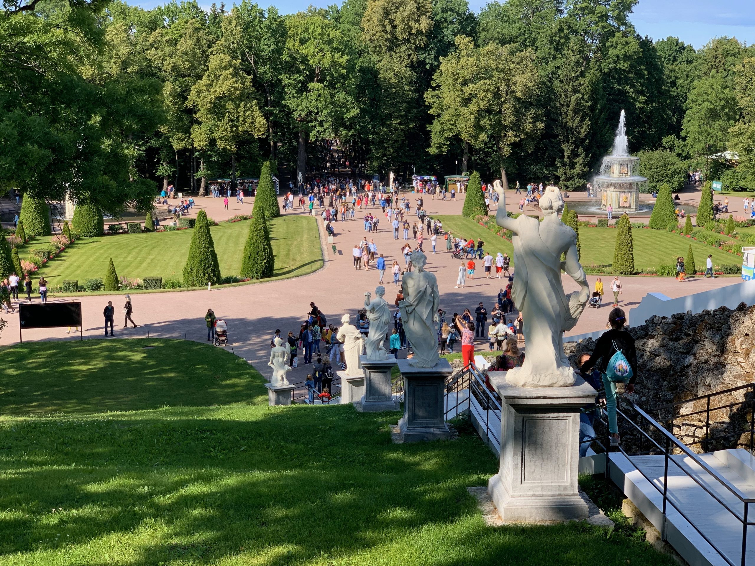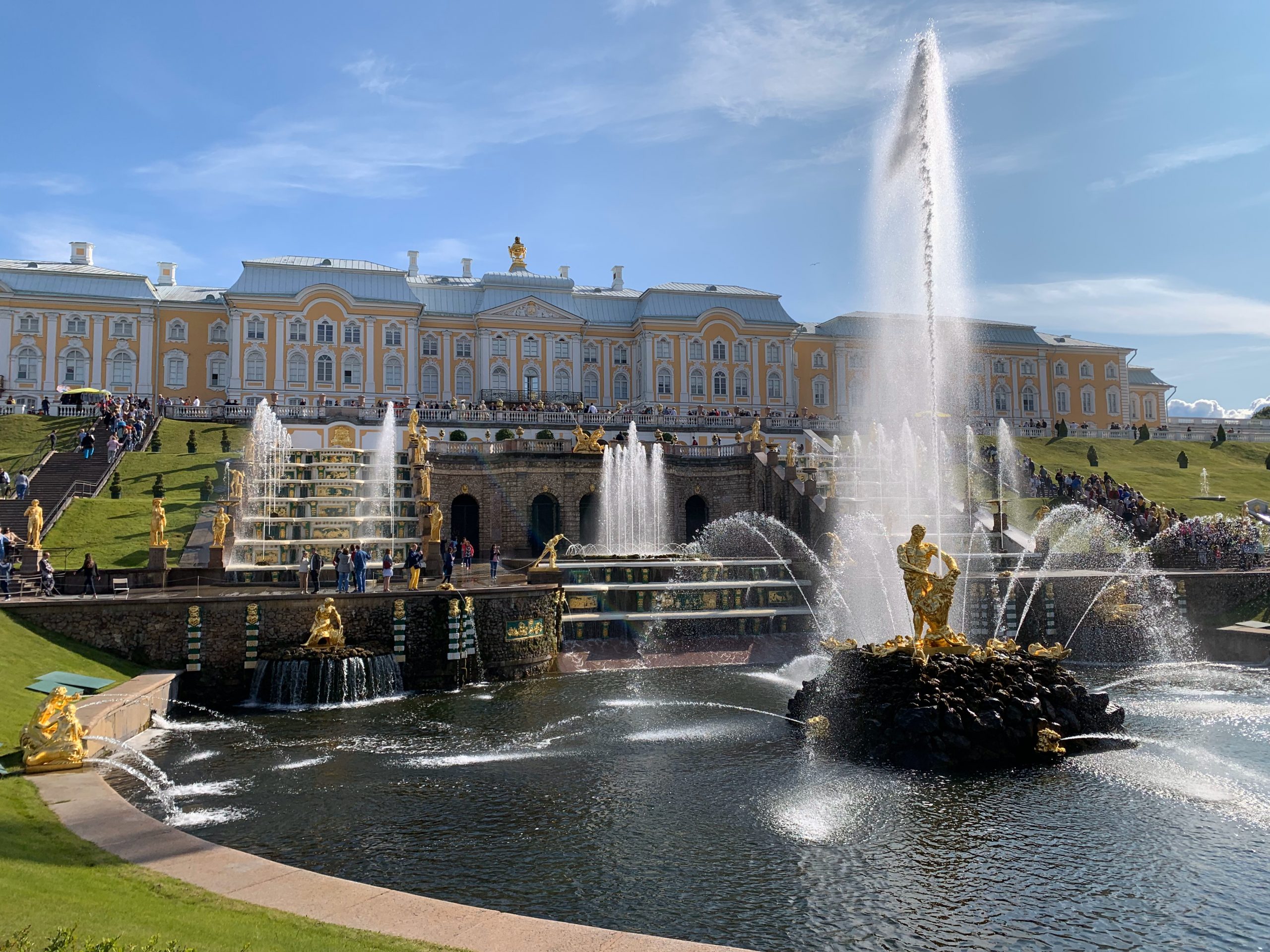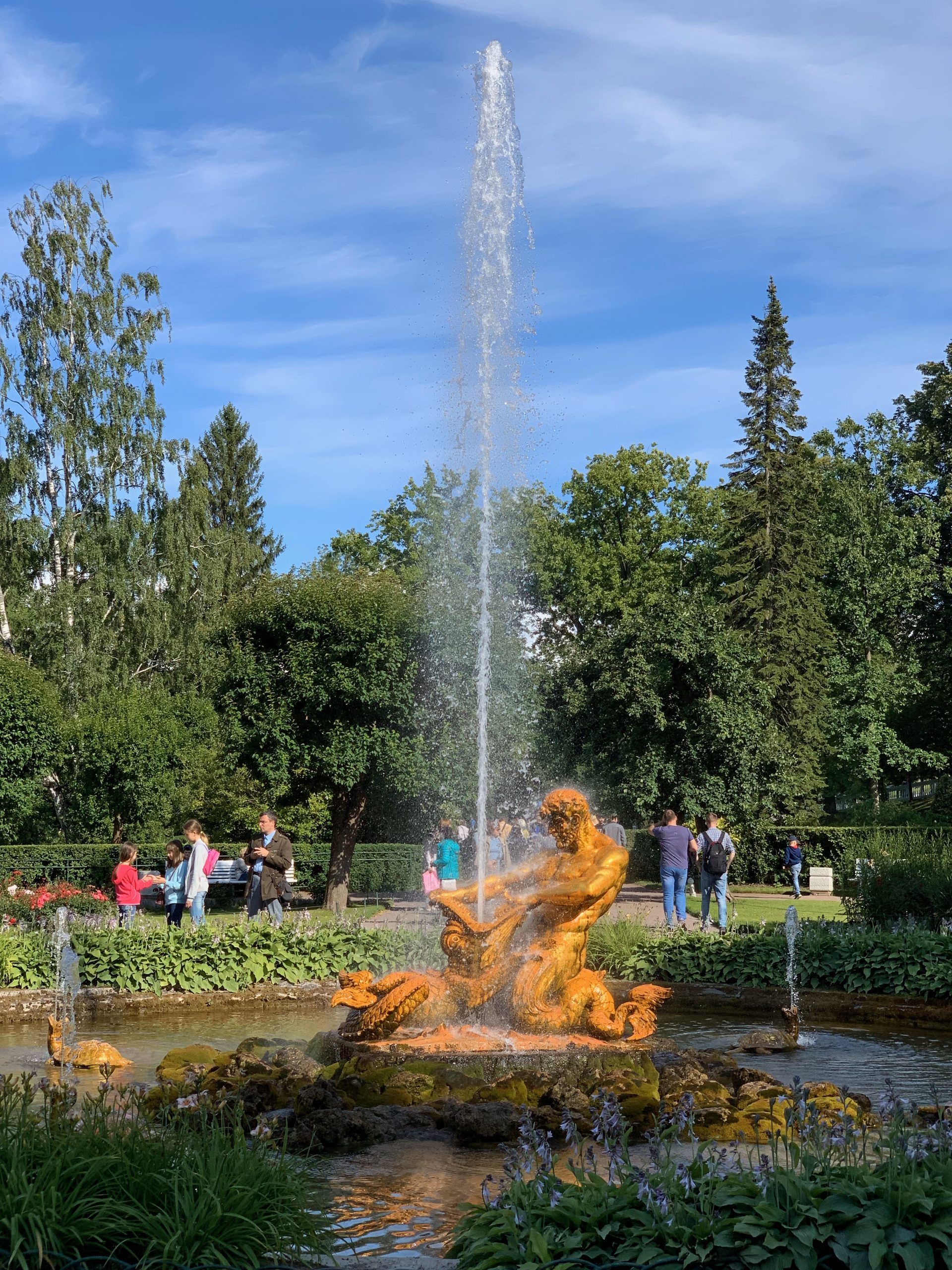 In July 2019 my wife and I spent an afternoon at Peterhof outside of St. Petersburg. This stop was a part of our Volga Dream cruise tour. We took a hydrofoil across the Gulf of Finland after lunch, toured the gardens and fountains, and were bussed back to our hotel in St. Petersburg. The weather was excellent, making the gardens a bit crowded. One afternoon is certainly not enough to see everything. We did not venture into Peterhof Grand Palace because of the excellent weather outside and a planned trip to visit the Catherine Palace in Pushkin (which, we were told, had similar architecture) the very next day.
