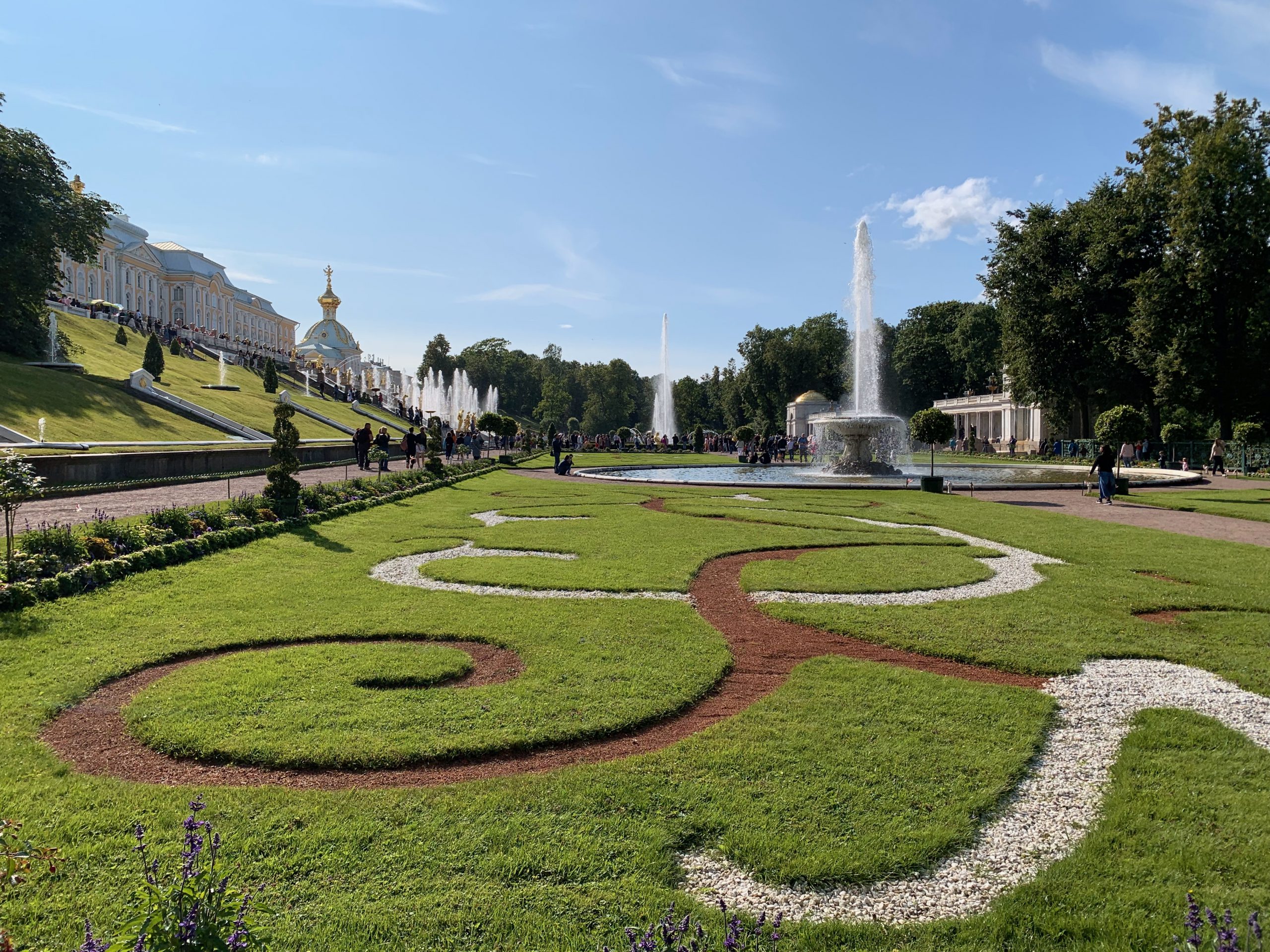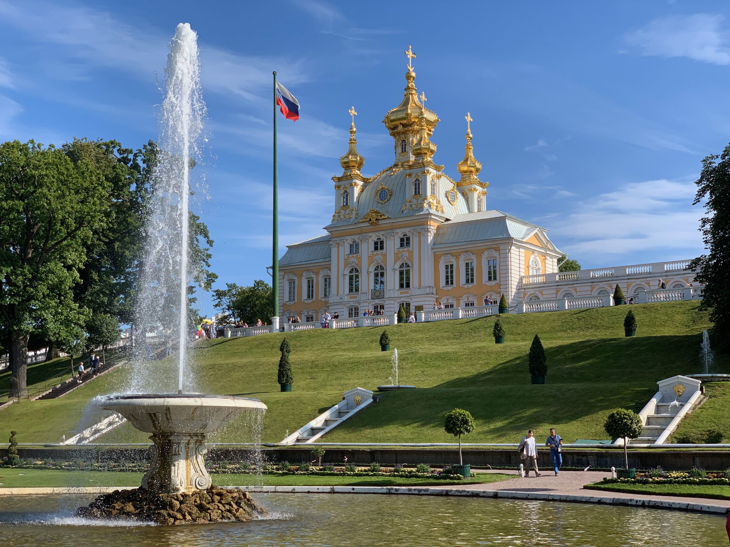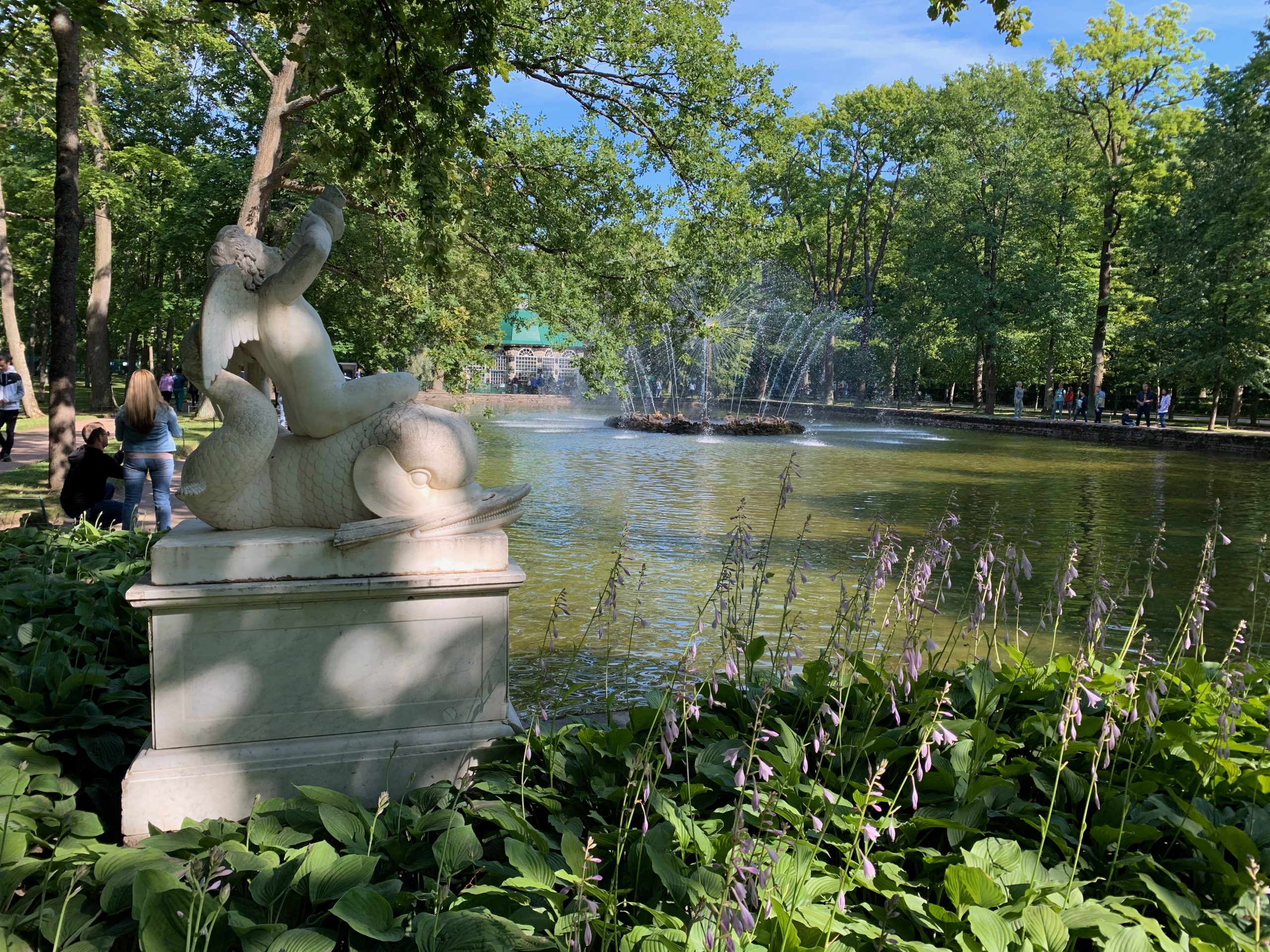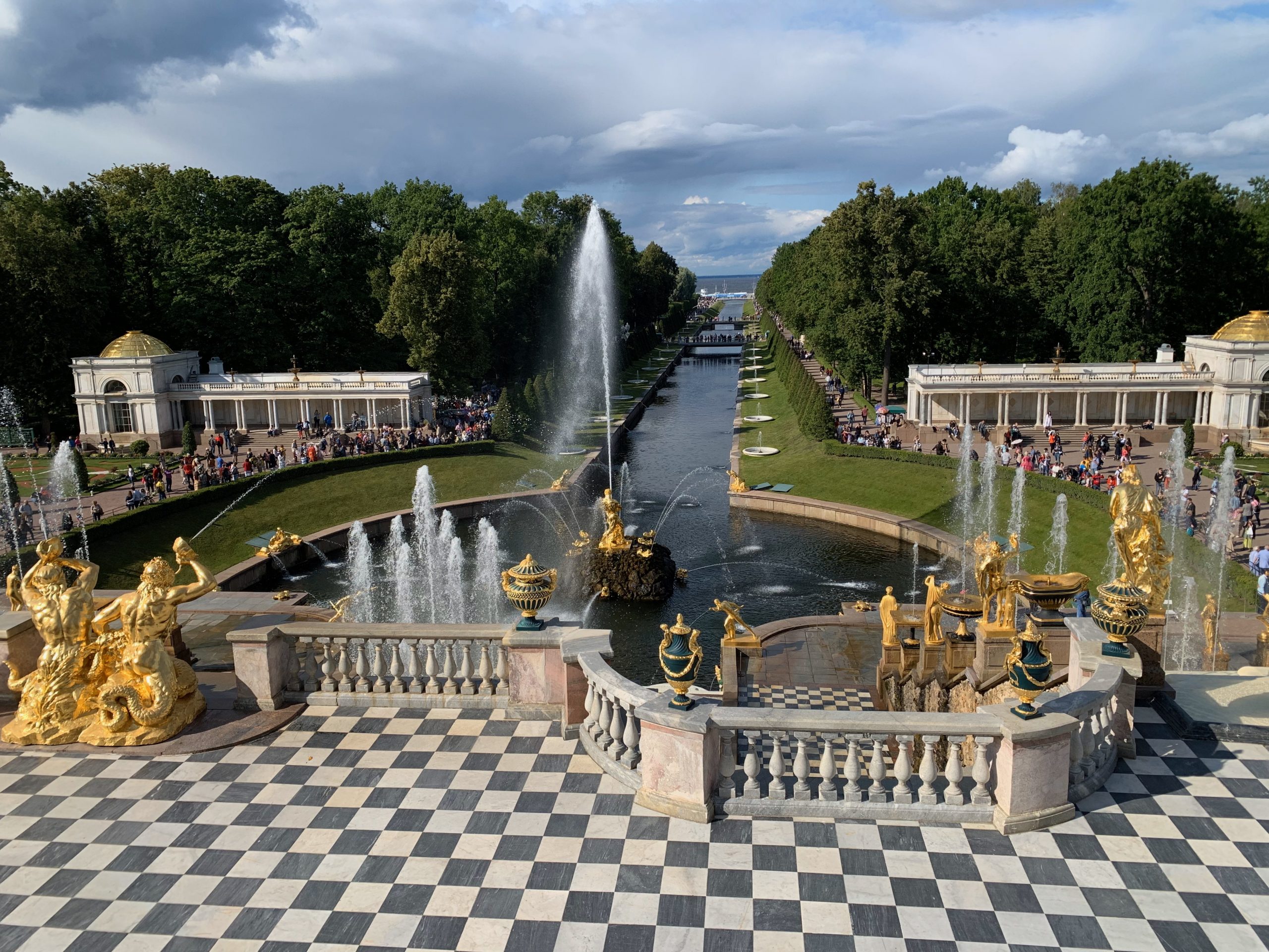 In July 2019 my wife and I spent an afternoon at Peterhof outside of St. Petersburg. This stop was a part of our Volga Dream cruise tour. We took a hydrofoil across the Gulf of Finland after lunch, toured the gardens and fountains, and were bussed back to our hotel in St. Petersburg. The weather was excellent, making the gardens a bit crowded. One afternoon is certainly not enough to see everything. We did not venture into Peterhof Grand Palace because of the excellent weather outside and a planned trip to visit the Catherine Palace in Pushkin (which, we were told, had similar architecture) the very next day.